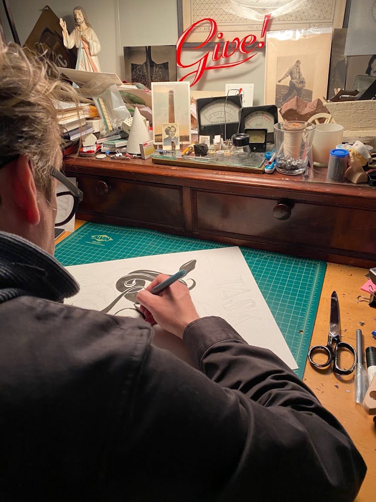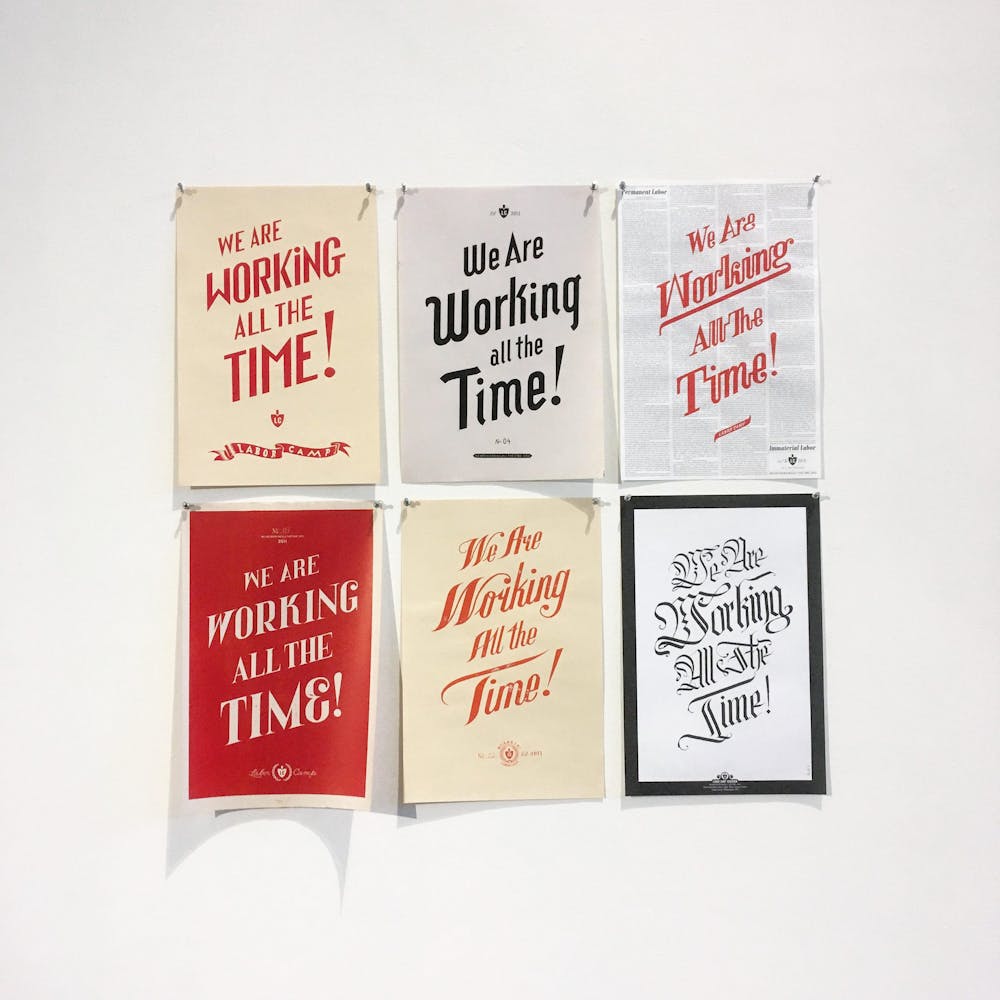 The series taps into Szyhalski’s professional and personal interests in the role art can play in social movements. Born in Poland in 1967, he grew up steeped in the visual vocabularies of control and resistance. He came of age in an era of general strikes and political upheaval, witnessing the rise (and eventual fall) of the Solidarity movement and the crumbling of communism. As a child he recalls receiving a copy of the book Front Line Poster, which catalogued stencil art printed by soldiers literally in the trenches of war. “I was always mesmerized, both by the aesthetic of these images but also by the notion of imagining these soldiers with their weapons alongside the guys printing these posters, basically sharing the same space and operating in two different ways,” he recalls. “So maybe there’s a naïve, romantic notion of art being able to function on the same level, right? Like having this lethal quality about it.” In those same years, shortly before moving to the United States in 1990, he began studying poster design and drawing. His schooling was entirely manual, he recalls—no computers—and to pass exams he had to render perfect Roman letterforms by hand, using only a straight-edge and compass.