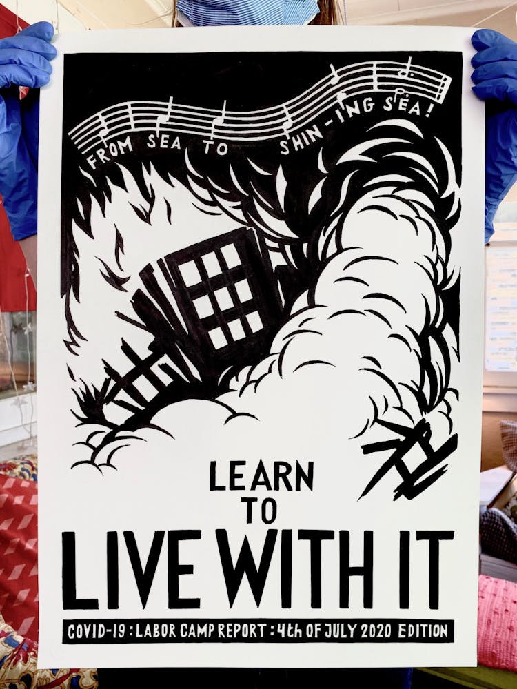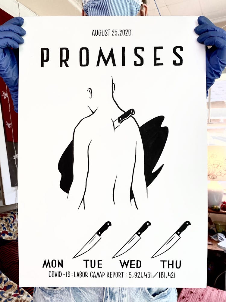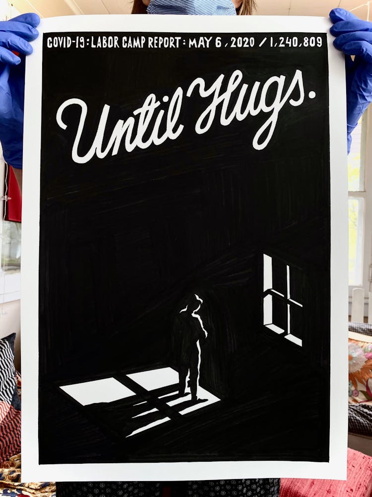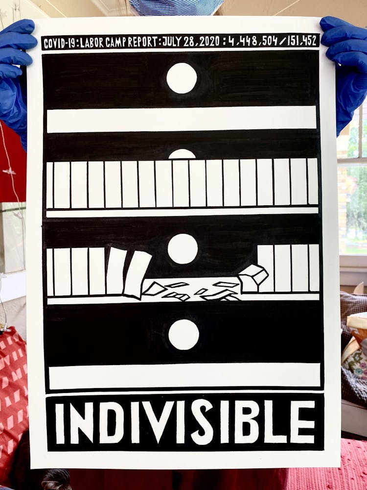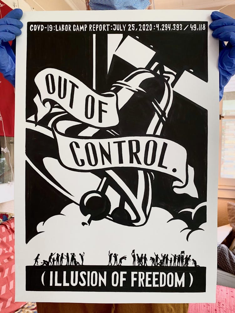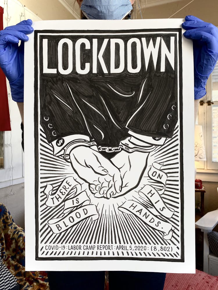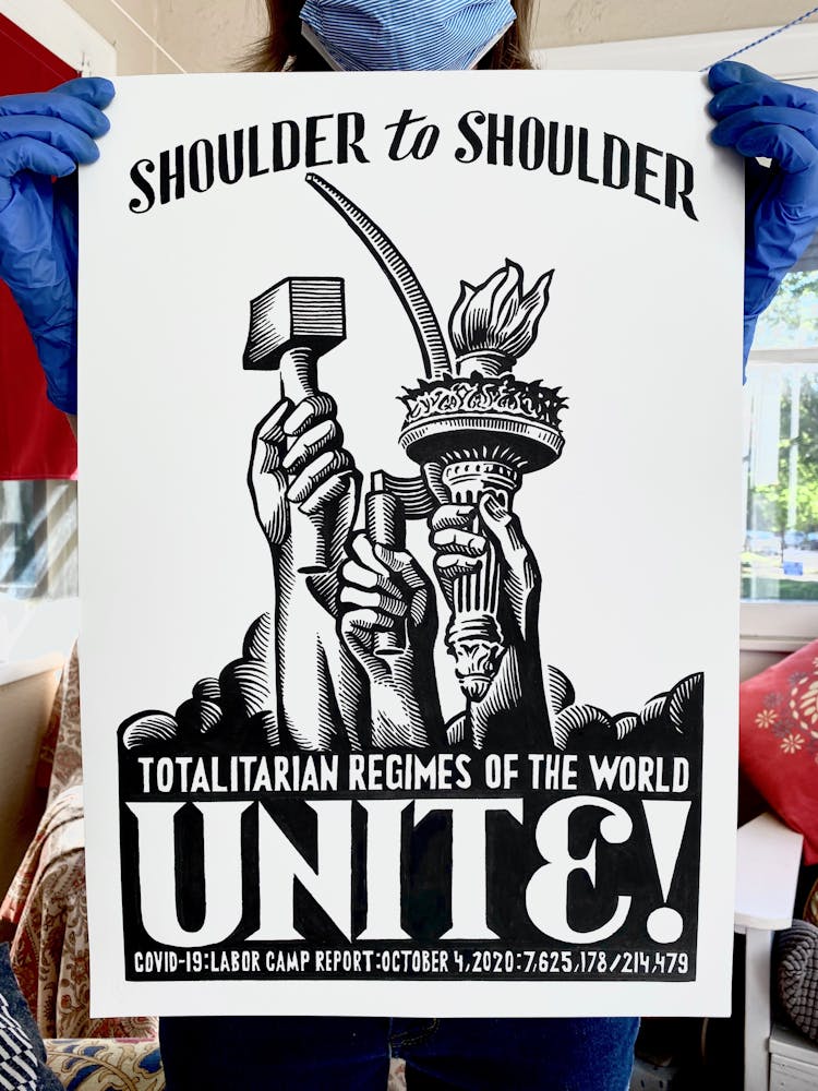 "This drawing is about my hope that, perhaps in a somewhat paradoxical way, the isolation of lockdowns will bring us together stronger, in solidarity, when the time comes to vote the criminal Regime out this November."