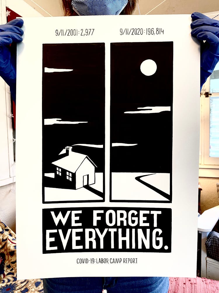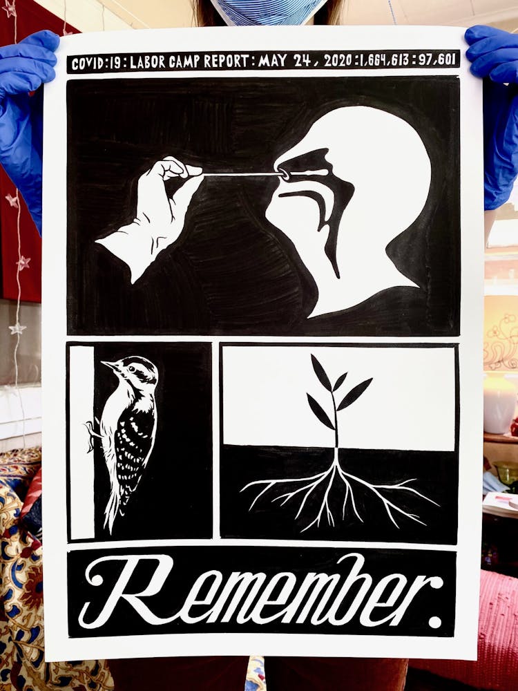 "What gets memorialized, and what must be remembered. What is remembered, and what is forgotten, and how rarely do we have agency over which is which. All this after I saw a woodpecker on the side of my house, and it instantly made me think of COVID-19 test procedure. I know: It doesn’t make sense. None of it does."