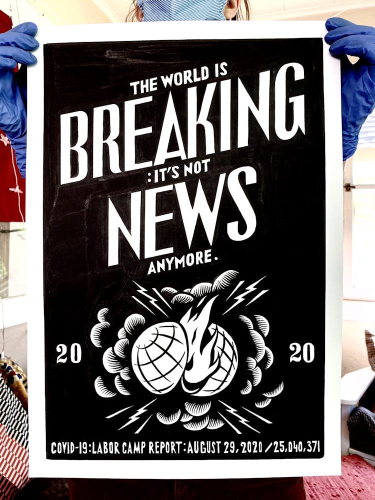 While this urgency lends the work much of its power, so does the universality of the issues he’s addressing. Just as he’s painstakingly drawing each letter by hand, Szyhalski is equally precise in selecting imagery to include in each work. Befitting a pandemic—a term that combines the Greek words for “all” and “people”—he’s sure to stay global in his approach. He never mentions any party, politician, or entity by name, whether Trump or Xi, price-gouging retailers or manufacturers of faulty facemasks. And, for the most part, he reports either the national or global statistics for infection rates and deaths, not local ones. (One particularly visceral exception was April 7’s “Wisconsin Edition.” He listed the count of infections and deaths in that state, along with a depiction of a voter’s hand sliced clean off by a kitchen knife as it deposited a ballot into a voting box—a clear commentary on a ruling from the US Supreme Court that blocked the governor’s efforts to postpone the state’s primary election over the risk of coronavirus infection posed by in-person voting).