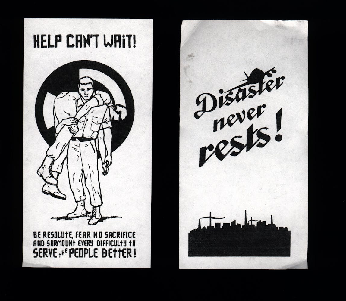 In the States, he explored other influences—performance, music, large-scale events, digital technology, and public practice—forming a far-reaching, interdisciplinary practice. He created works ranging from Ding an Sich (The Canon Series), an interactive net-art piece commissioned by the Walker in 1997, to environments involving salt, pine caskets, video projections, and the tools of labor (as seen in his 2015 show Three Factory Pieces at Minneapolis’s now-defunct Soap Factory) to a “public-access letterpress printer,” in which he created giant letterforms to transfer the words of community members onto massive banners for use in protests from the Justice for Jamar demonstrations in North Minneapolis to the #NoDAPL encampment at Standing Rock. But when the coronavirus pandemic struck, he found himself confined at home and, as a result, returning to the hands-on practice of drawing that marked his early development as an artist—and to the familiar language of propaganda.