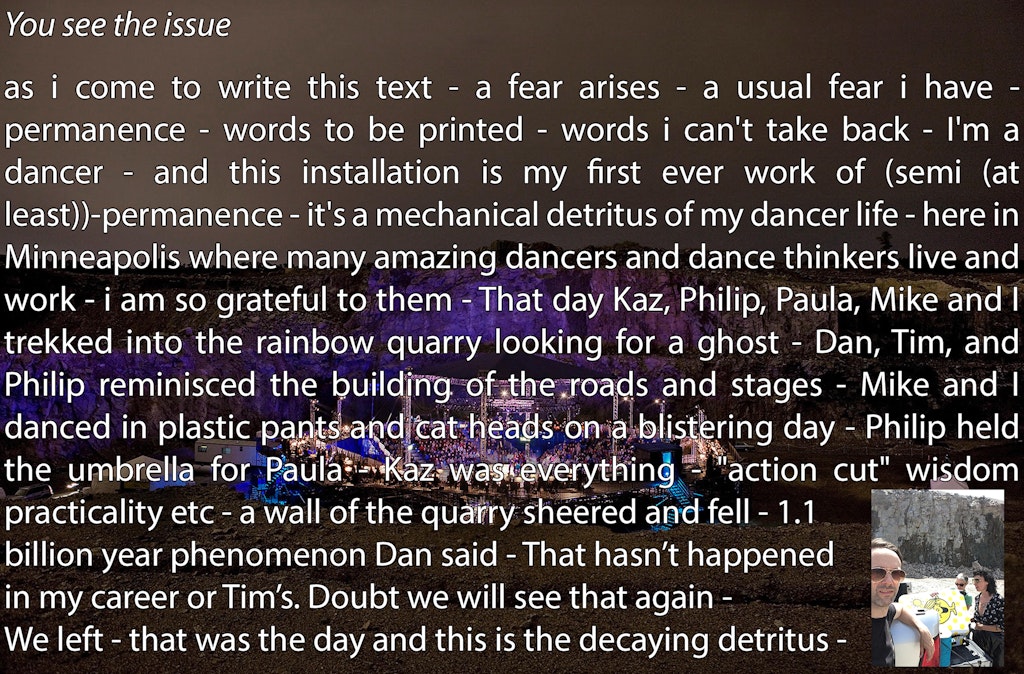 At the very same time I knew I wasn’t going to do 4, Philip told me about this curatorial conference a September 28–29 invitational research convening on performance curation, and it was originally scheduled to be on the Saturday of my show week. He told me quickly in the car, and afterward I was like, what? The whole idea of going to Minneapolis is so that–