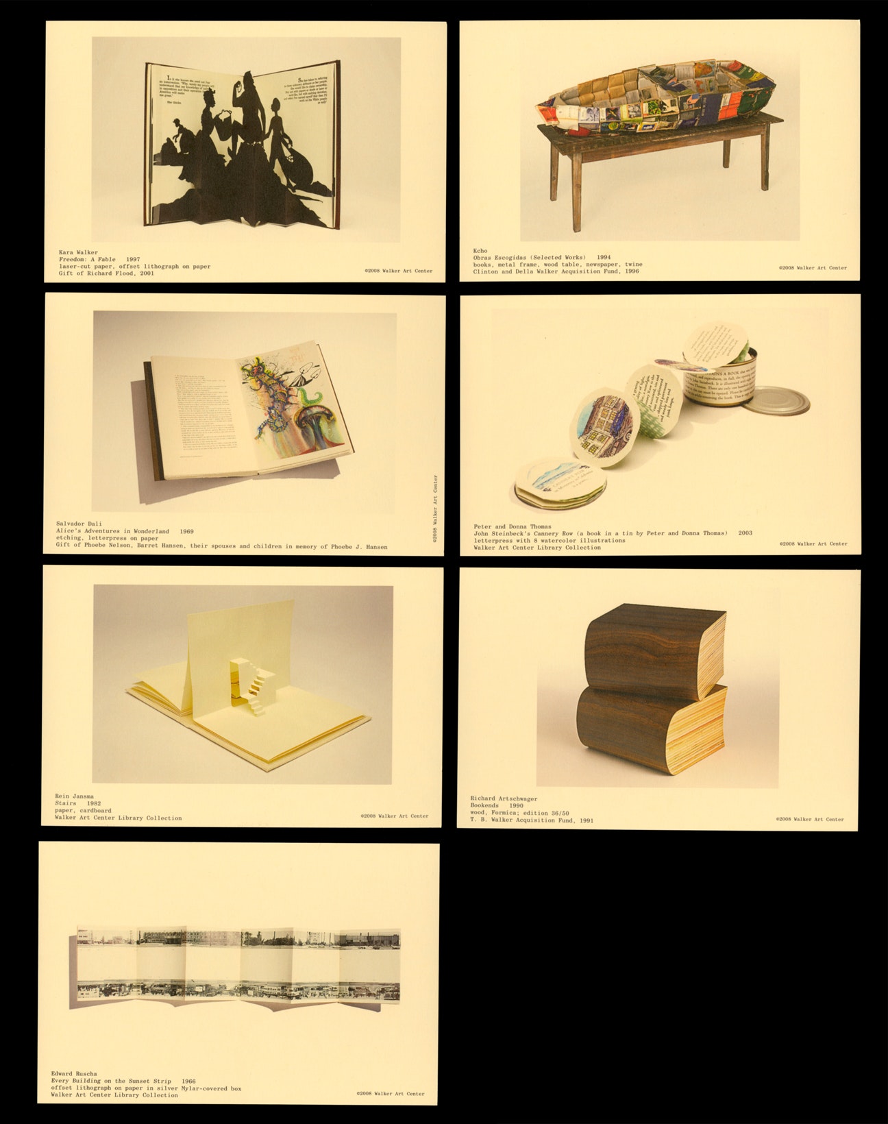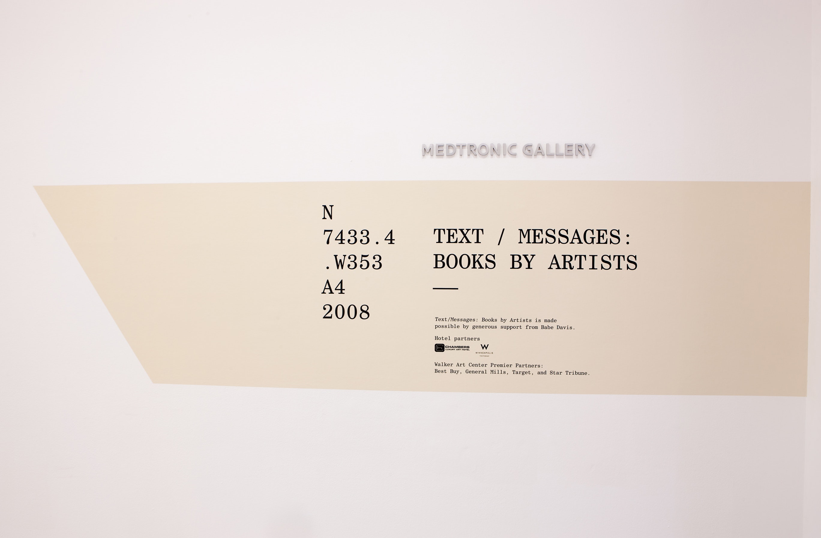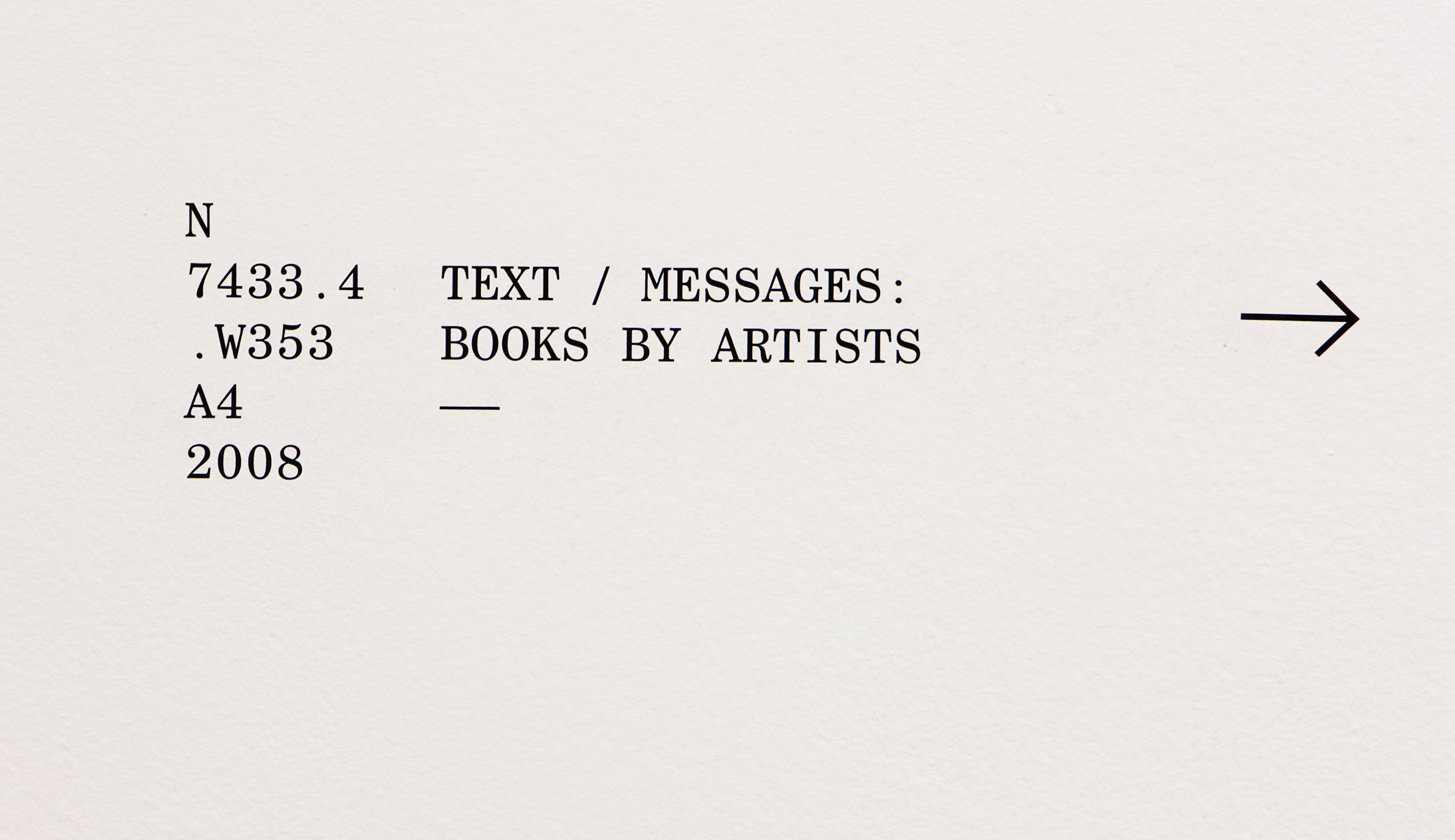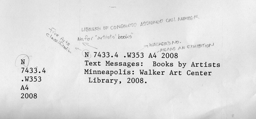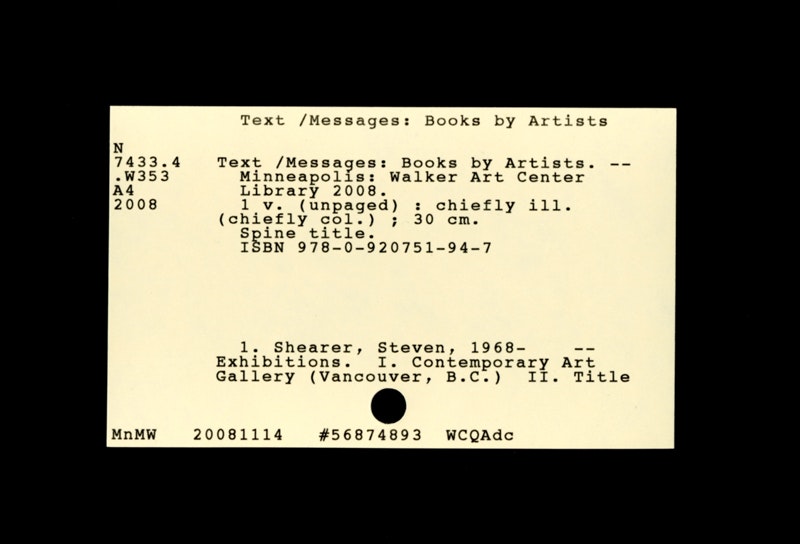 These somewhat esoteric index cards, punched with one hole at the bottom edge, and housed one after another in long, narrow drawers, formed the inspiration for the exhibition graphics of Text/Messages: Books by Artists, on view now in the Medtronic Gallery.
