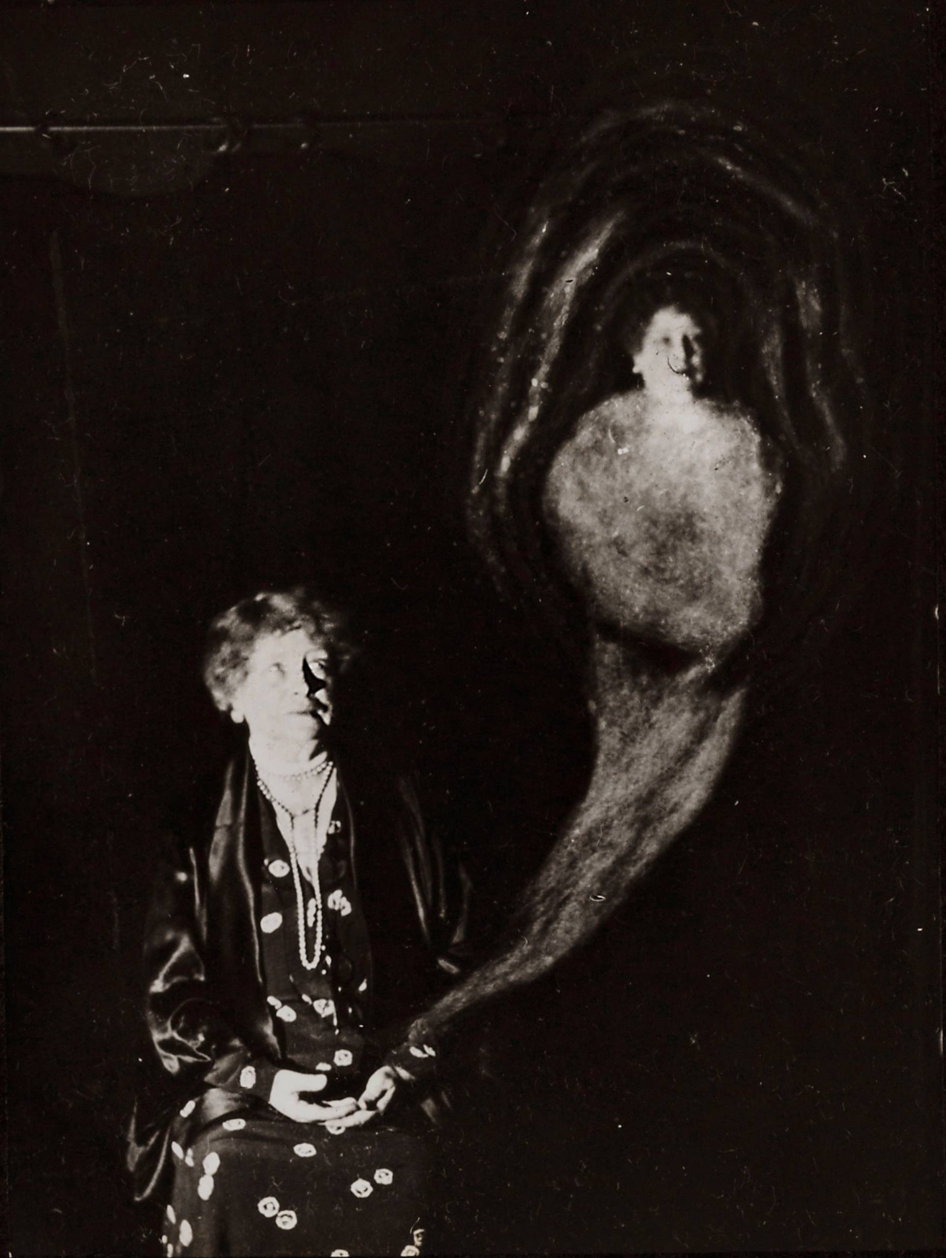 - Albert Von Schrenck-Notzing, The medium Eva C. with the materialization of a woman’s face, 1911. Courtesy of the Photographic Collections of the Institut für Grenzgebiete der Psychologie und Psychohygiene, Freiburg im Breisgau.