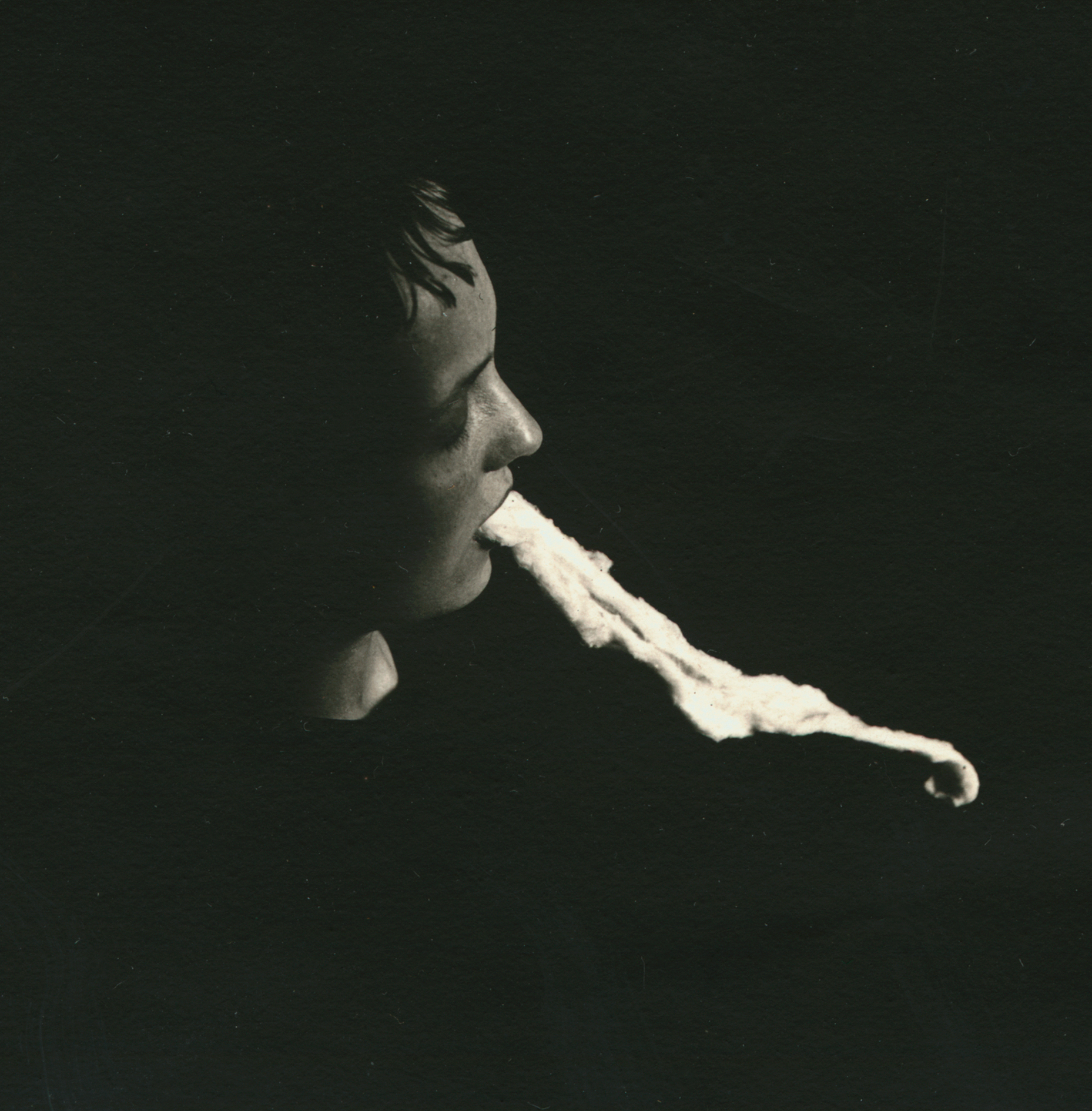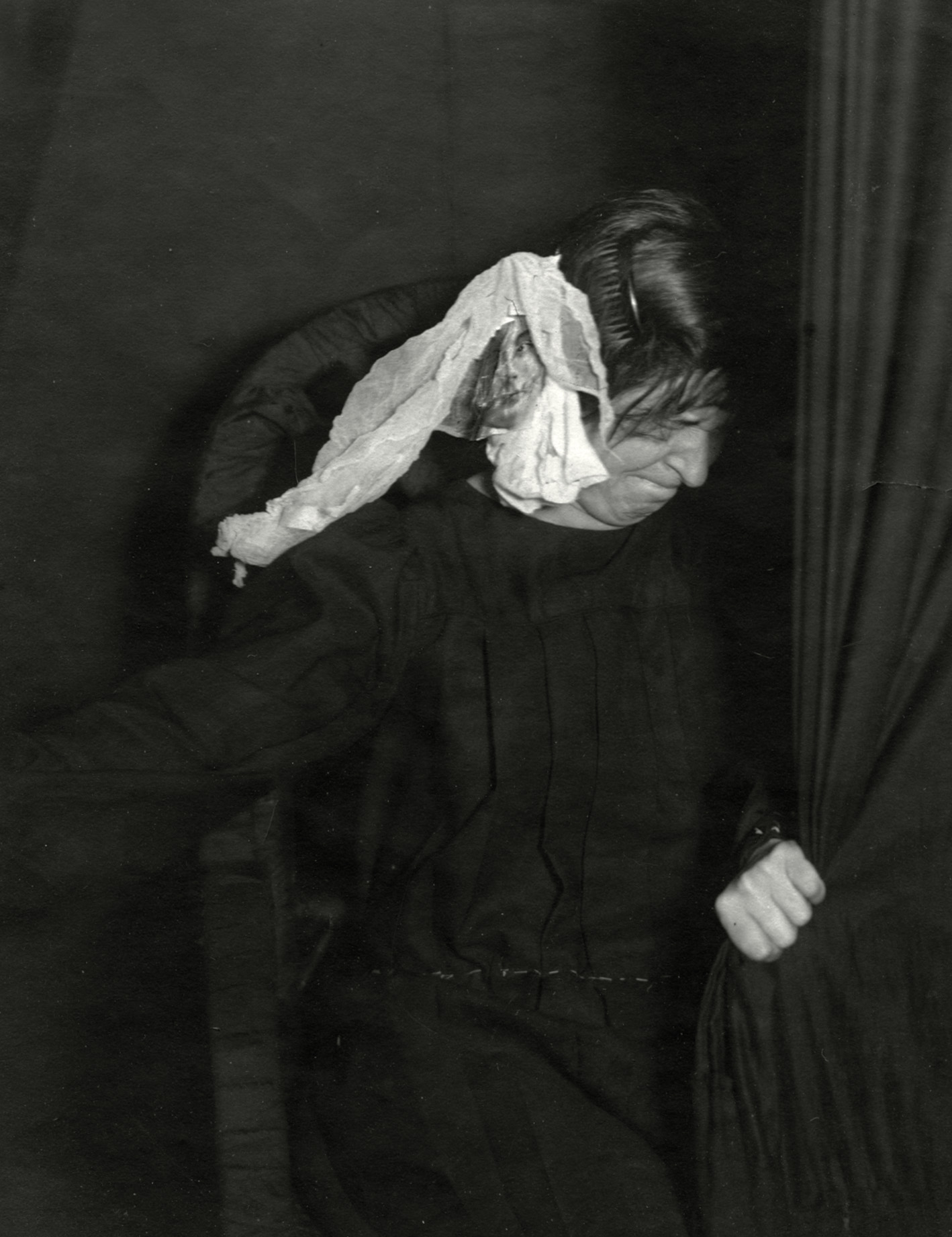 - The medium Stanisława P: emission and resorption of an ectoplasmic substance through the mouth. Albert von Schrenck-Notzing, 1913. Courtesy of the Photographic Collections of the Institut für Grenzgebiete der Psychologie und Psychohygiene, Freiburg im Breisgau.