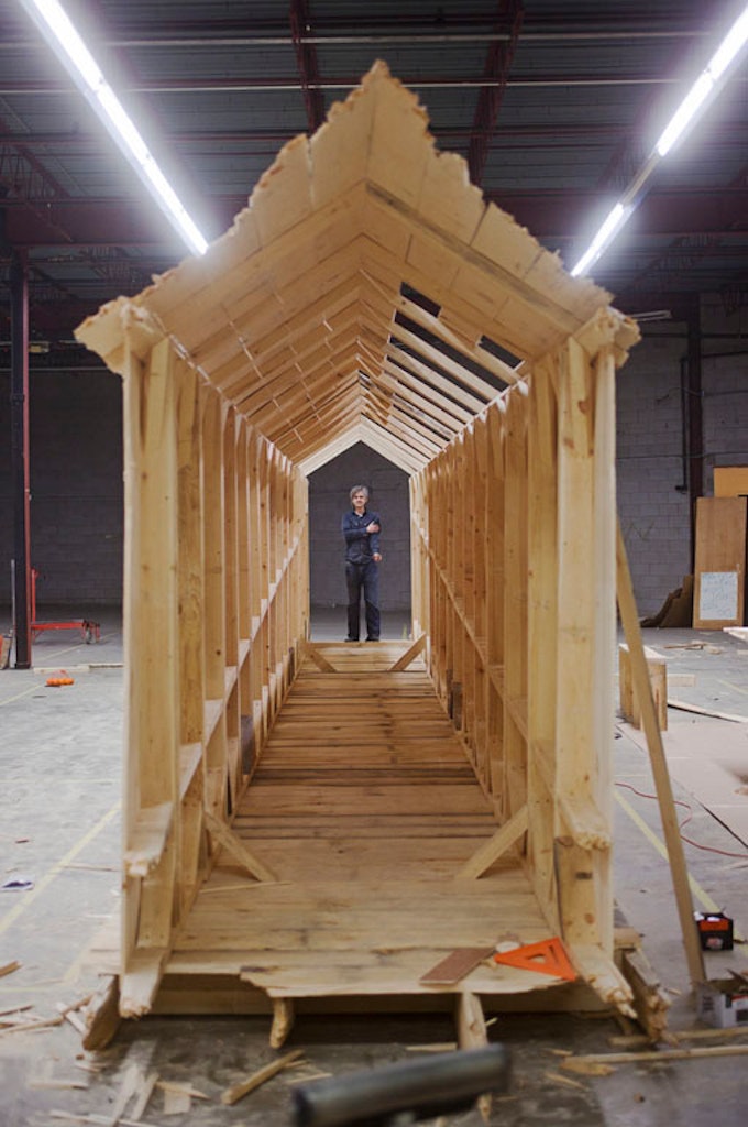 The Walker’s Cargill Lounge is currently altered by a site-specific installation by artist Chris Larson, part of The Spectacular of Vernacular. Looming and curious, the nature of the piece invites viewers to contemplate its function. Certainly there are common inquiries that arise. And there are remarks that run in similar sentiments to one another. Artist-specified solitary experiences monitored by Visitor Services staff reveal other, more personal responses to the structure. Quiet observations rooted in visitors’ past are often brought forth by the very scent of the wood. One woman stood near the structure quietly recalling childhood time spent with her carpenter father. Memories of shop classes and kids’ forts are commonly revived after experiencing this work that Larson calls Unnamed. Other observations stem from a feeling that took over while inside the structure. A Hong Kong resident talked about the peacefulness inside, reminded all the while of quiet time spent at islands near his home. (See other views here and here.)
