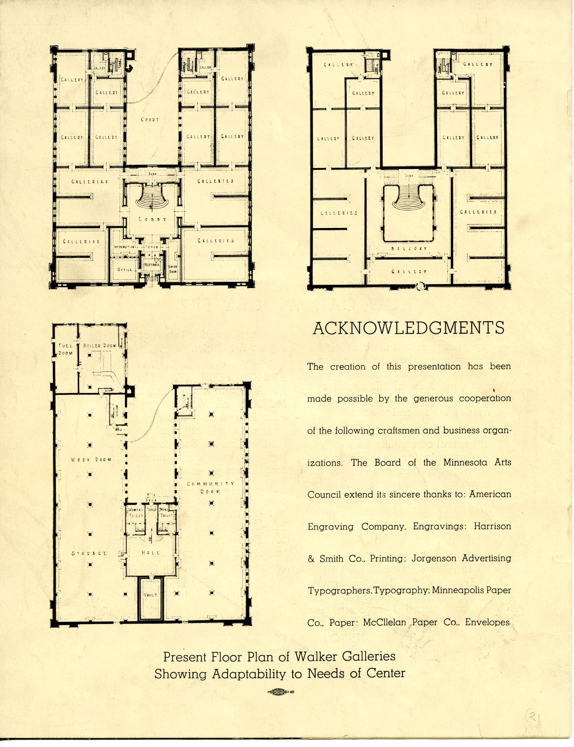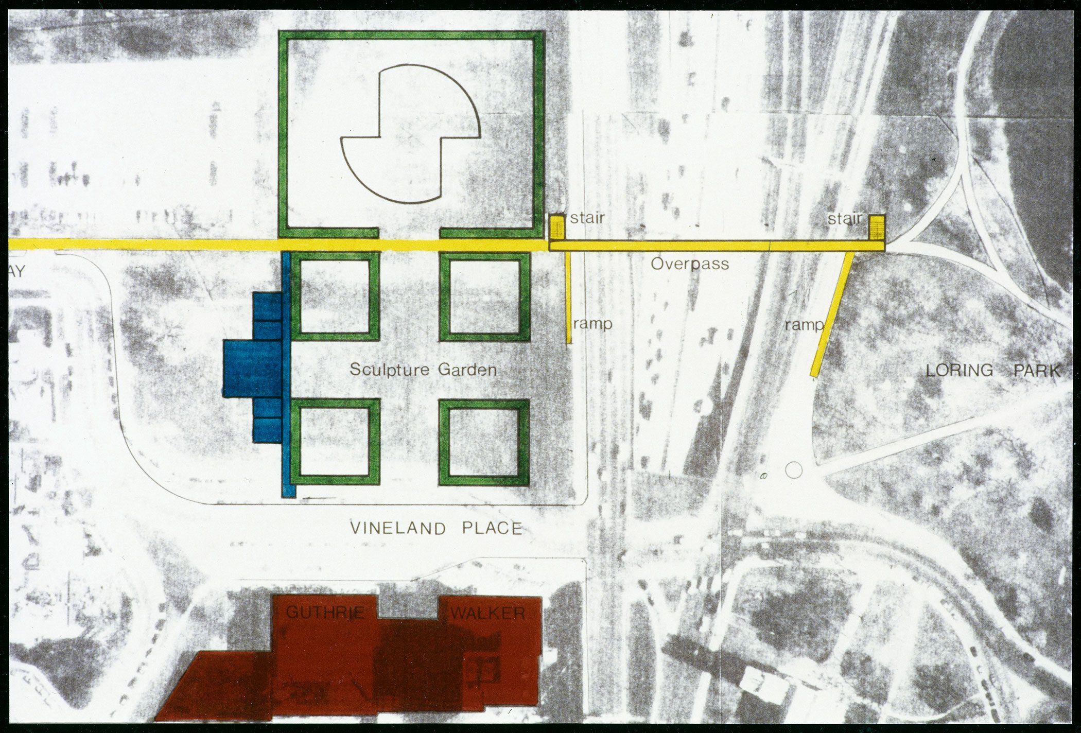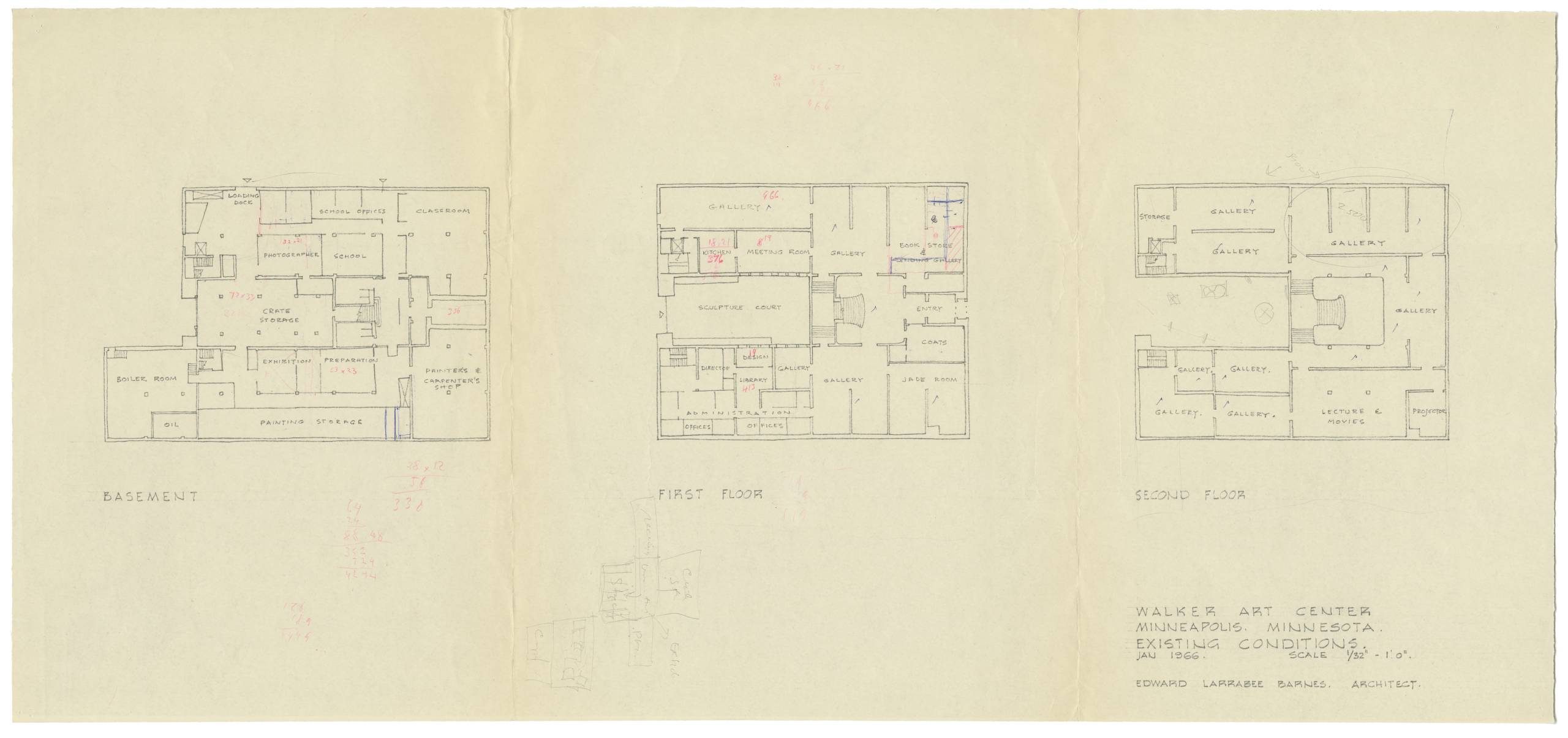 The Walker is a good example of the transformation of a sculpture court over time. Built in 1927 by architects Long and Thorshov, the original Walker Art Center building, known as the Walker Art Galleries, was in the classical style, with an exterior court located in the center of the building. As shown here, the original drawings identify the space as a court, but not specifically a sculpture court, because the Walker did not focus on collecting sculpture until the 1950s. Only in the mid 1960s did it come to be described as a “sculpture court.”