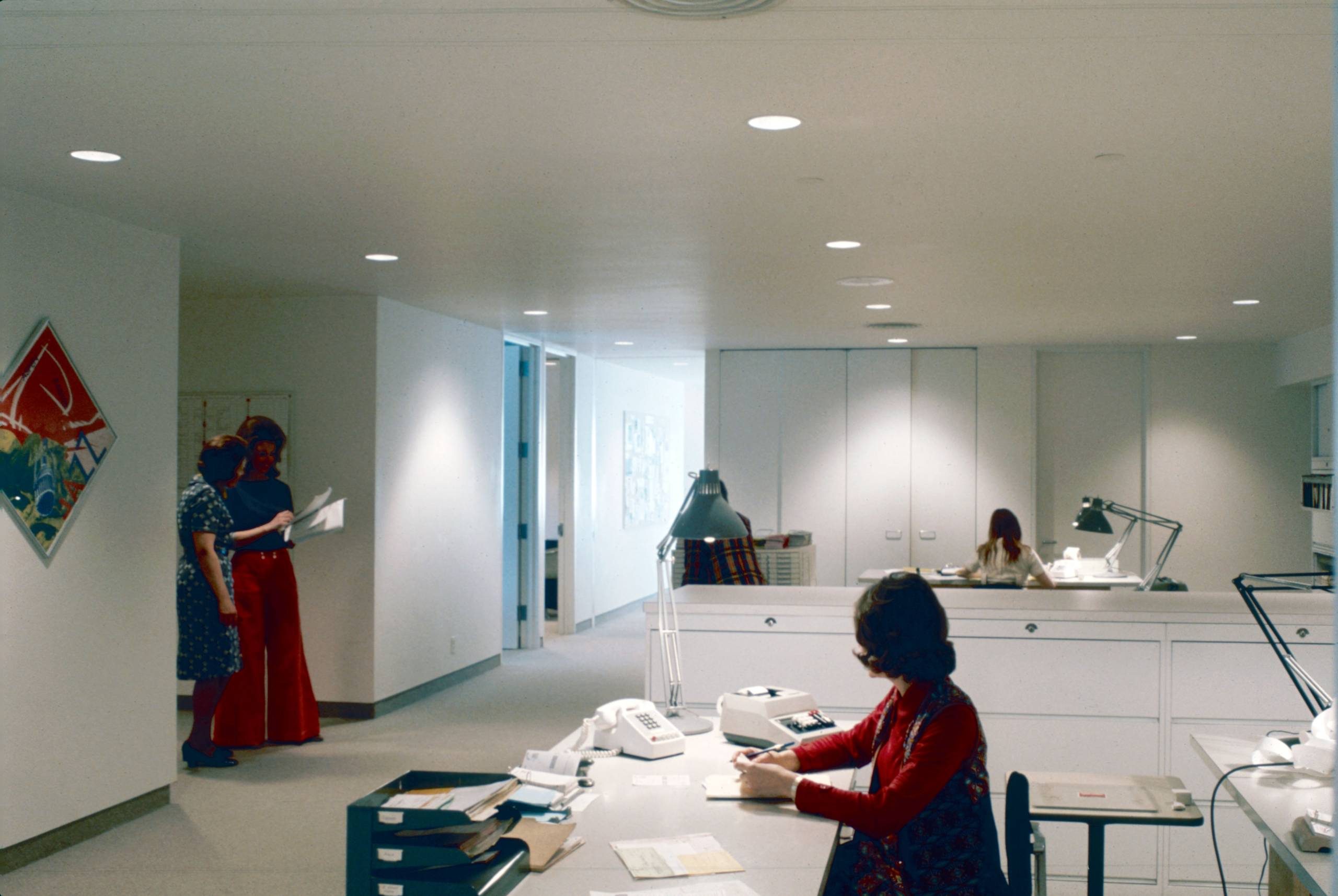 The sculpture court was a small exterior space connecting galleries, meeting rooms, and administration offices. As in earlier examples of courts, the sculpture needed to be small enough to fit in the space and made from materials that could withstand the elements. That meant that many sculptures could only be displayed in interior spaces, such as Claes Oldenburg’s Three-Way Plug (1975), installed in the lobby of the Edward Larrabee Barnes building.
