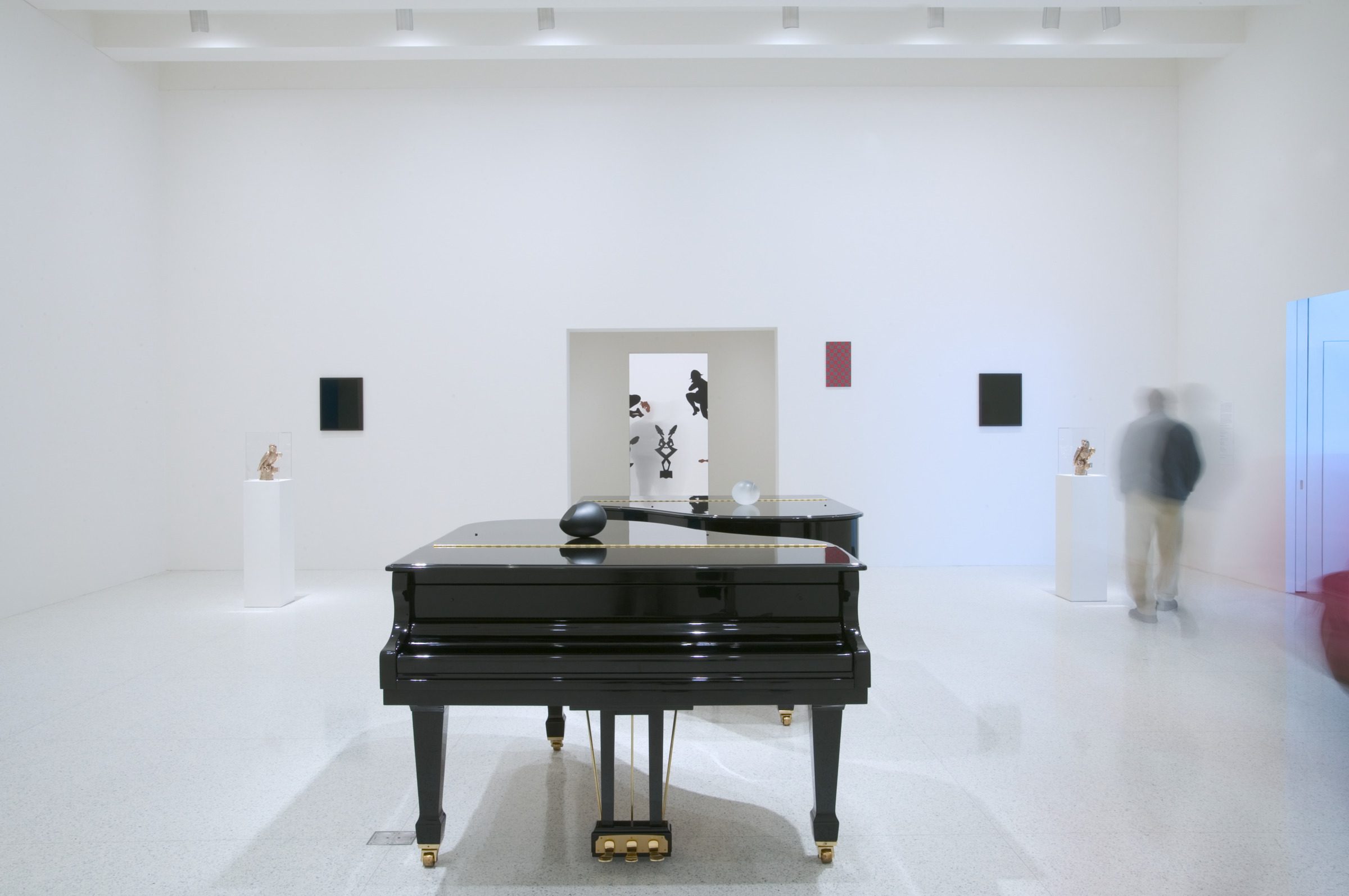 While the works on view are diverse in their use of materials and composition, they all are interpretations of the human figure. In works like Ernest Trova’s Study: Falling Man (Wheel Man) (1965), it’s easy to recognize the human figure; others, like Sherrie Levine’s Black Newborn (1994), may not be. Inspired by Constantin Brancusi’s Newborn (1915) series, Brancusi abstracted a child’s sleeping head in marble, showing only a hint of a nose or eyebrow. Taking the concept further, Levine created a work in glass that is an abstracted oval resembling an egg.