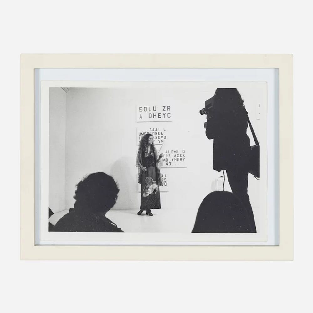 Such a floating sense of play imbues so many of Cointet’s performances. Indeed, the same could be said of his esoteric yet gorgeous drawings, which employ a kind of typoésie: textual and cursive formations that reside on the line of pattern and intelligibility, seeming at once mere image and semiotic sign, prompting an awareness in the would-be reader of their own interpretative projections onto the material. Among his performances like The Paintings of Sophie Rummel, 1974, these valences could entail Janet Susan Mary Hoffman—better known as the Warhol superstar Viva, with whom Cointet roomed when first arriving on these shores from France—speaking aloud the numbers and letters appearing on the canvases onstage. When spoken by Viva with variously quizzical tones and urgent enunciations, these characters would suddenly seem freighted with narrative meaning, however opaque they might have been as texts appearing on canvas or found on the page. And in Tell Me, 1979, the words spoken by actresses describe paintings around them, even while their behavior implies that they are—incongruously—just preparing for dinner. Within the scene, their words seem like stand-ins or placeholders, no longer correlating with their conventional meanings.