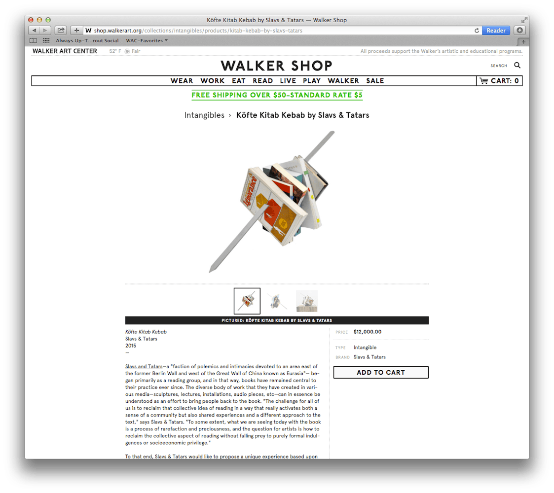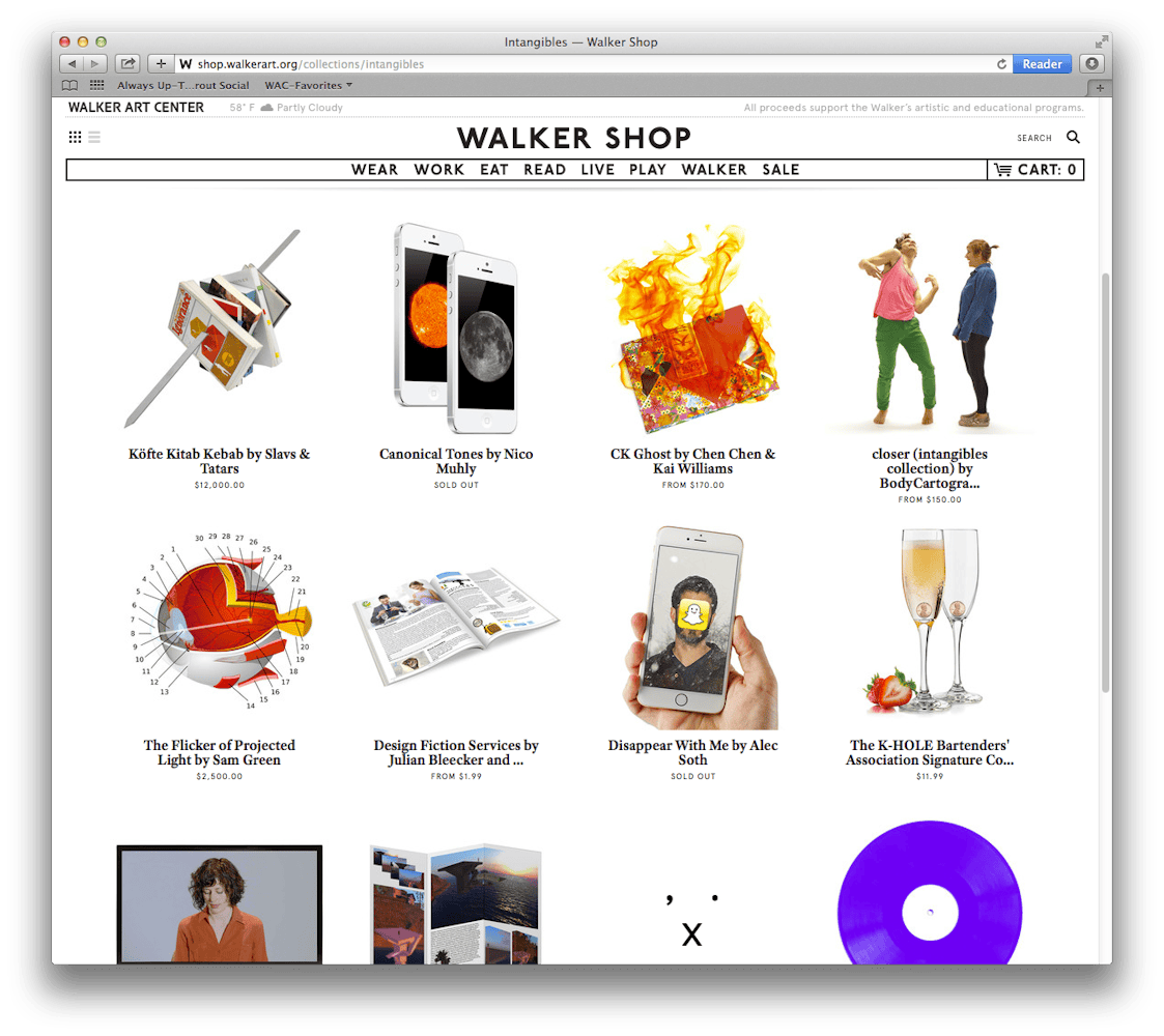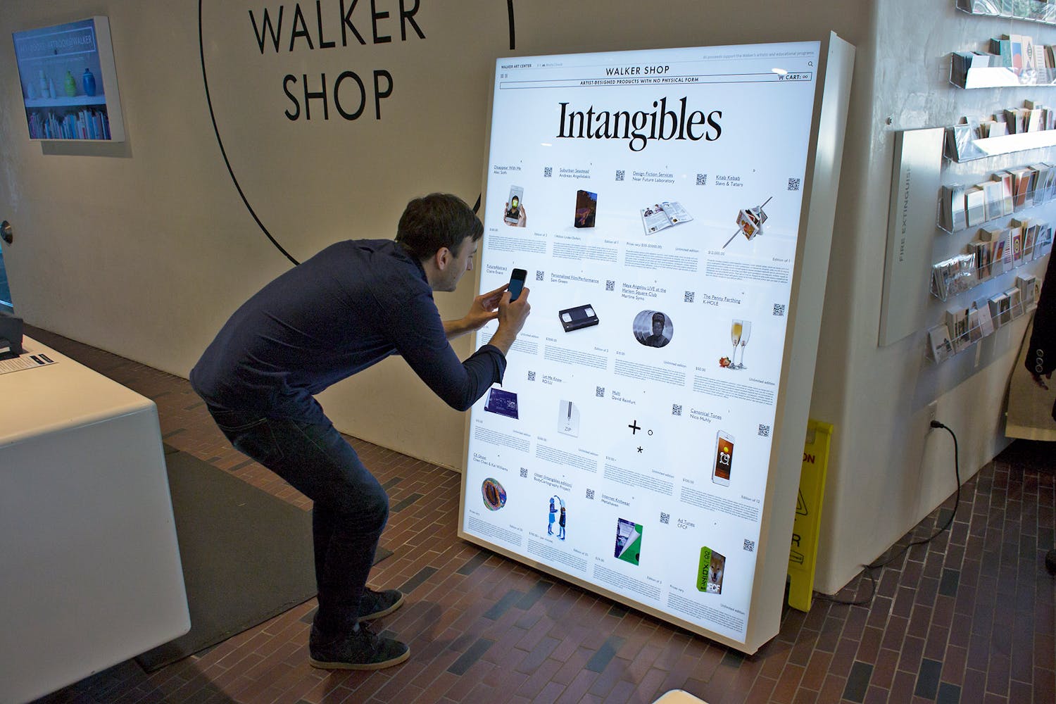 The Walker’s new online collection further destabilizes our valuations of intangibility by shifting the context. Instead of just peddling the usual wares — generally speaking, objects that can be held — the Walker’s online shop page is now also selling what it calls Intangibles, a multidisciplinary collection of art/products whose primary purpose is to call attention to their intangibility. So instead of retro drinking glasses and billfolds, we have a ZIP file and disappearing photographs; instead of stamp sets and watches, we have burning paper and a screening for a film that has yet to be made.