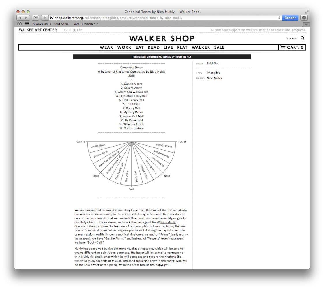 We are surrounded by sound in our daily lives—but how do we curate the sounds that we control? How can these sounds amplify or glorify our daily rituals, slow us down, and mark the passage of time? Nico Muhly’s Canonical Tones explore the textures of our everyday routines, replacing the notion of “canonical hours”—the religious practice of dividing the day into multiple prayer sessions—with his own canonical ringtones. Muhly has conceived twelve different ritualized ringtones, which will be sold to twelve different people. Upon purchase, the buyer will be asked to correspond with Muhly via email, after which he will compose and record the ringtone (between 10 to 30 seconds of music), and send the single copy to the buyer, who will be the sole owner of the piece. Once all 12 ringtones have been purchased, composed, recorded, and installed—once all twelve ringtones are playing randomly on twelve phones around the world, like a bell calling us to worship—Canonical Tones will be complete.