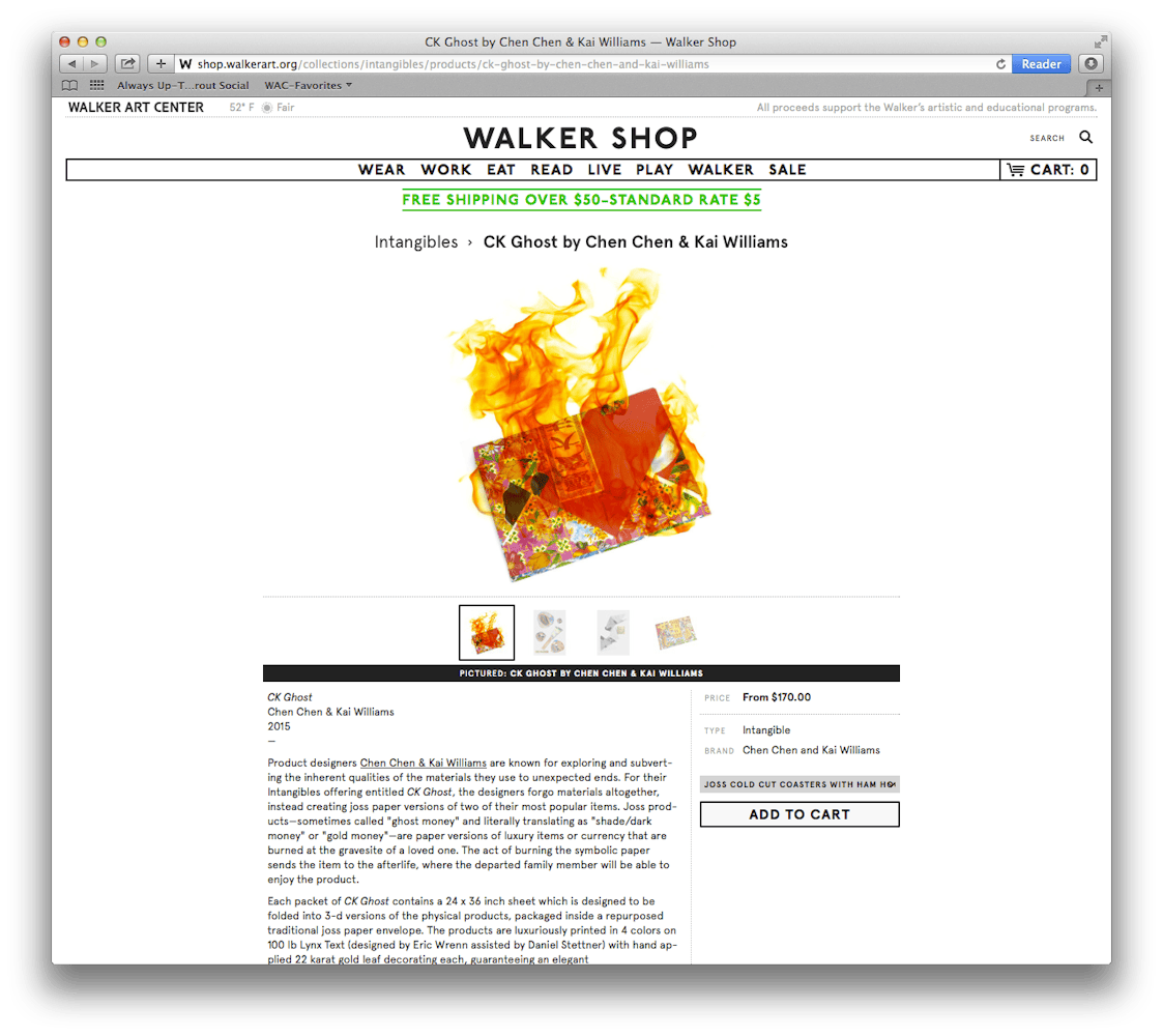 For their Intangibles offering, product designers Chen Chen & Kai Williams have created joss paper versions of two of their most popular items. Joss products—sometimes called ‘ghost money’ and literally translating as ‘shade/dark money’ or ‘gold money’—are paper versions of luxury items or currency that are burned at the grave site of a loved one. The act of burning the symbolic paper sends the item to the afterlife, where the departed family member will be able to enjoy the product. Each packet of CK Ghost contains a 24 x 36 inch sheet which is designed to be folded into 3-d versions of the physical products, packaged inside a w traditional joss paper envelope. Each joss product is priced exactly the same as their physical counterparts, which are also available in the Walker Shop. CK Ghost is only complete once the paper has been burned—to that end, buyers who burn their copies will receive a 20% rebate of the purchase price.