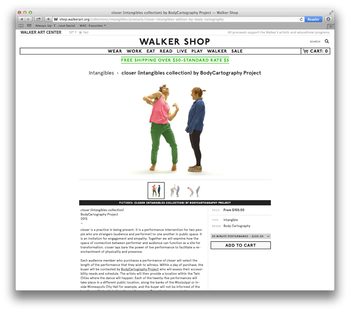 closer is a practice in being present. It is a performance intervention for two people who are strangers (audience and performer) to one another in public space. It is an invitation for engagement and empathy. closer lays bare the power of live performance to facilitate a re-enchantment of physicality and presence. The buyer will select the length of the performance that they wish to witness. Each of the twenty-five performances will take place in a different public location, along the banks of the Mississippi or inside Minneapolis City Hall for example, and the buyer will not be informed of the location until shortly before the performance. Once the buyer meets the performer at the location at the agreed upon time, the performance will begin. The performer will be present with the audience member, to meet their tone, energetically and physically. Audiences will have the agency to choose how they watch, follow, and interact with the performer.
