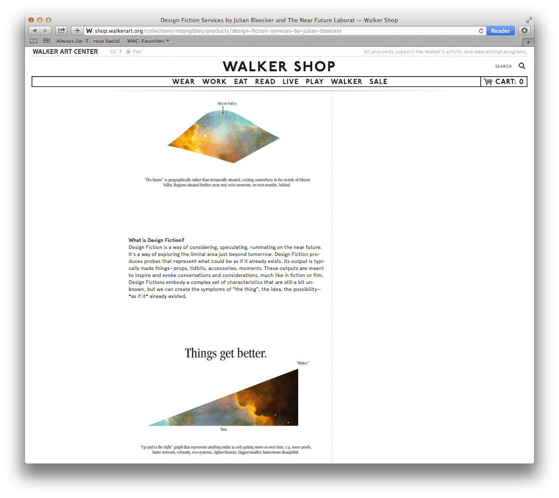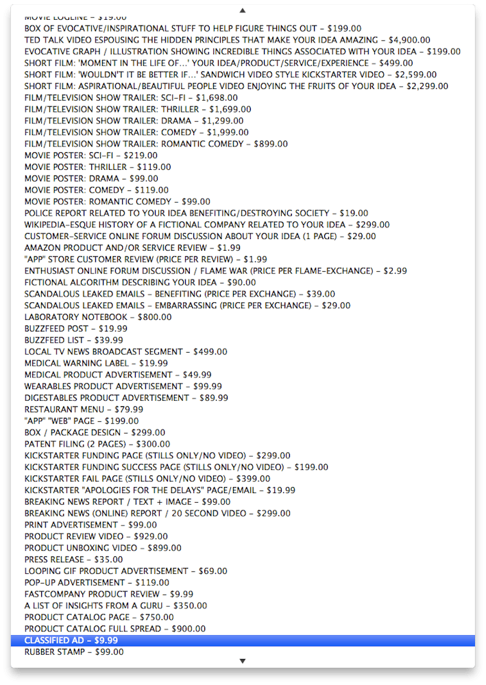 This Intangible offers you the chance to purchase your own Design Fiction. We (The Near Future Laboratory) can translate your whims, hunches, instincts, big-idea, question, intractable problem, business issues—and more—into a subtle, seductive representation that will (in all likelihood) serve as a totemic contemplative reflection. An object that, like a modern Crystal Ball, will lead you to greater insight. Your Design Fiction object may even lead you to the answers you think you need. Design Fiction archetypes: Product brochure ($399). Film trailer ($1699). Buzzfeed post ($19.99). Medical warning label ($19.99). Fictional algorithm ($90). Restaurant menu ($79.99). Package design ($299). Press release ($35). Classified ad ($9.99). Product unboxing video ($899). Wearables product advertisement ($99.99). Patent filing ($300). Many more options available online.
