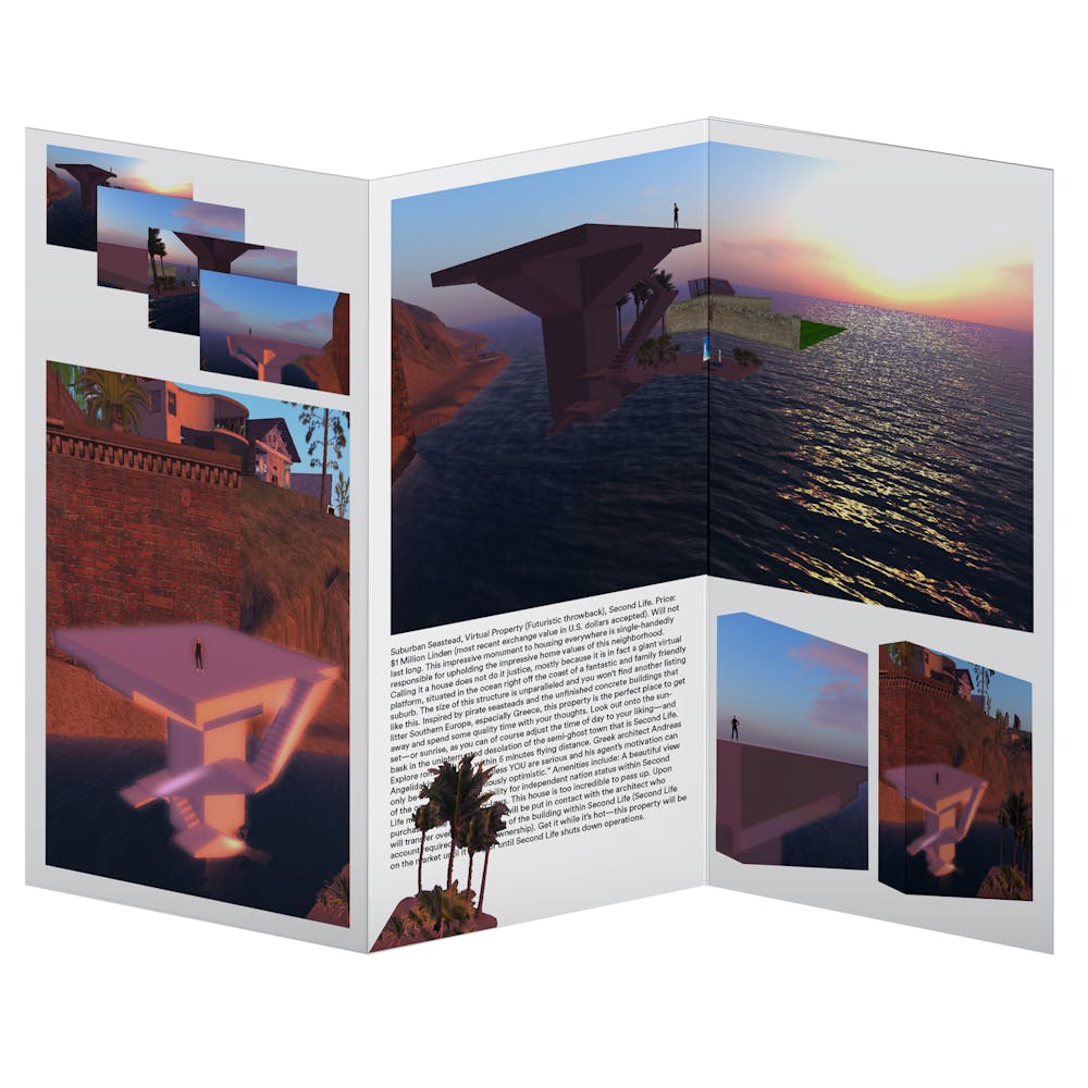 Suburban Seastead is a giant platform, situated in the ocean right off the coast of a family friendly suburb, existing within the virtual world of Second Life. Inspired by pirate seasteads and the unfinished concrete buildings that litter Southern Europe, this property is the perfect place to get away and spend some quality time with your thoughts. Look out onto the sunset and bask in the uninterrupted desolation of the semi-ghost town that is Second Life. Explore romantic ruins within 5 minutes flying distance. Greek architect Andreas Angelidakis is not serious unless YOU are serious and his agent’s motivation can only be described as “cautiously optimistic.” Potential eligibility for independent nation status within Second Life maritime/economic by-laws. Upon purchase of the building, buyer will be put in contact with the architect who will transfer over the possession of the building within Second Life (Second Life account required to assume ownership).
