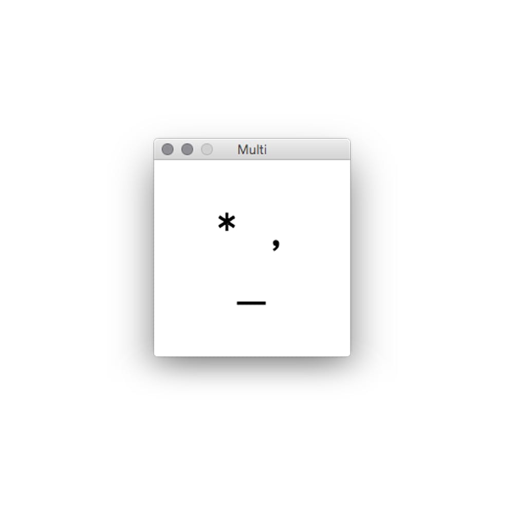Multi is a contemporary multiple by O-R-G (David Reinfurt). It is software, a (very) simple application for making faces. Working from a limited stock of punctuation glyphs, Multi tirelessly assembles various configurations. At any one moment, Multi presents one of 1,728 possible arrangements, each a face built from minimal typographic furniture. Unlike a typical multiple that consists of many identical copies from one design, Multi is one original set of instructions constantly producing alternate versions. Multi is distributed as a password-protected download link, sent via email. The buyer’s email address is then collected and added to a running file that includes names, dates, and addresses of everyone who has bought Multi before. This data is included with the purchase of the software as a text file. The value of Multi increases as a network effect of the number of users who have purchased it. Every time Multi is reproduced, its data becomes richer.