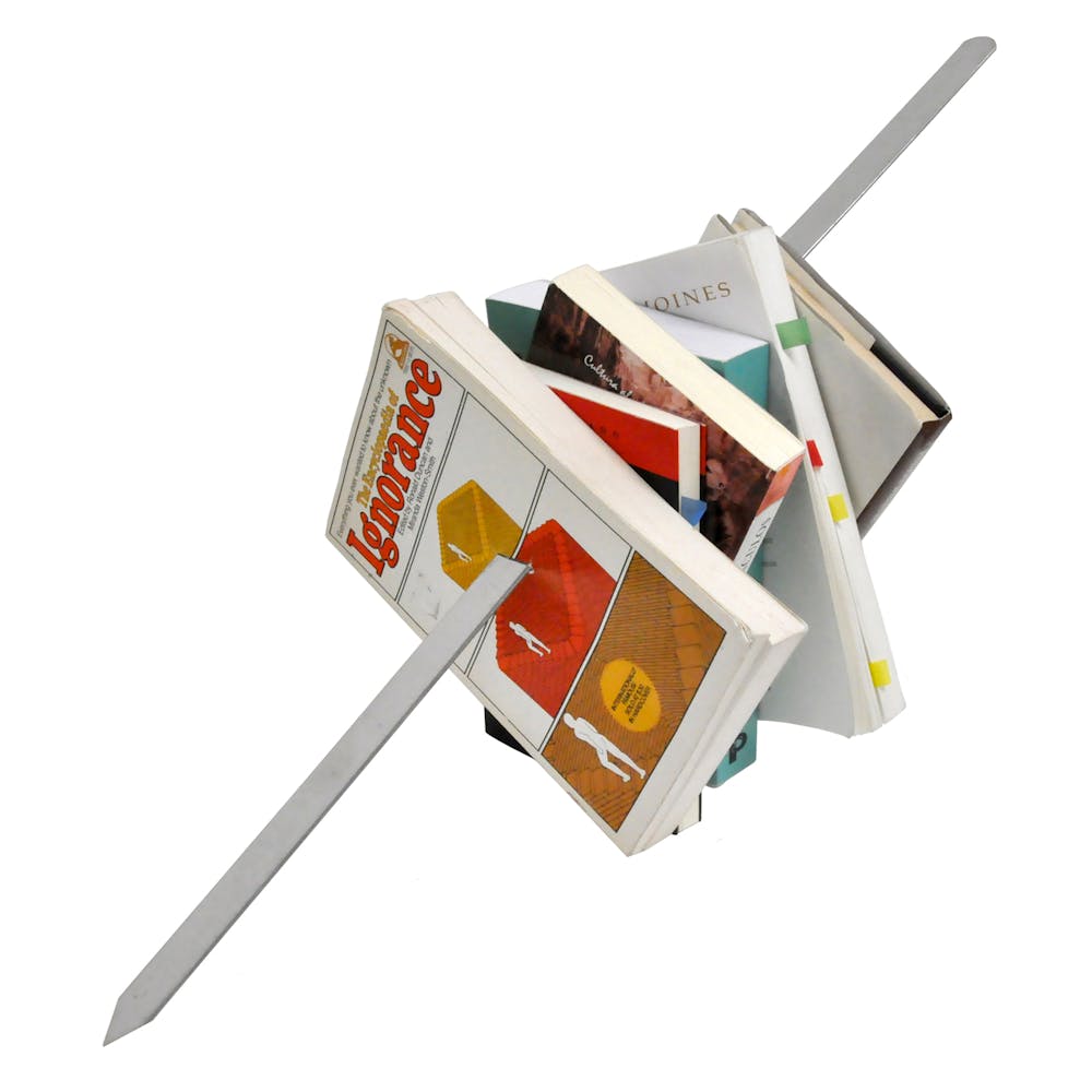 For their Intangible, Slavs & Tatars will travel to the home or office of the buyer and spend a day or two with him/her, diving into their library, conversing with the buyer about certain texts, drawing connections between lines of thought, investigating the nature of the buyer‘s interests, and sharing their process. Upon the completion of the reading group, they will choose 2 to 3 of the buyer's books with the eventual aim of incorporating them into the Kebab sculpture. Upon returning to Berlin with the buyer’s books, they will continue the discussion remotely, and choose the remaining volumes to be skewered from their personal collection. The purchase price covers travel and accommodation costs for the artists, and the personalized reading group experience. The sculpture—as the form that frames the nature of the interaction, and a by-product of the newly formed relationship between the artists and the buyer—will also belong to the buyer.