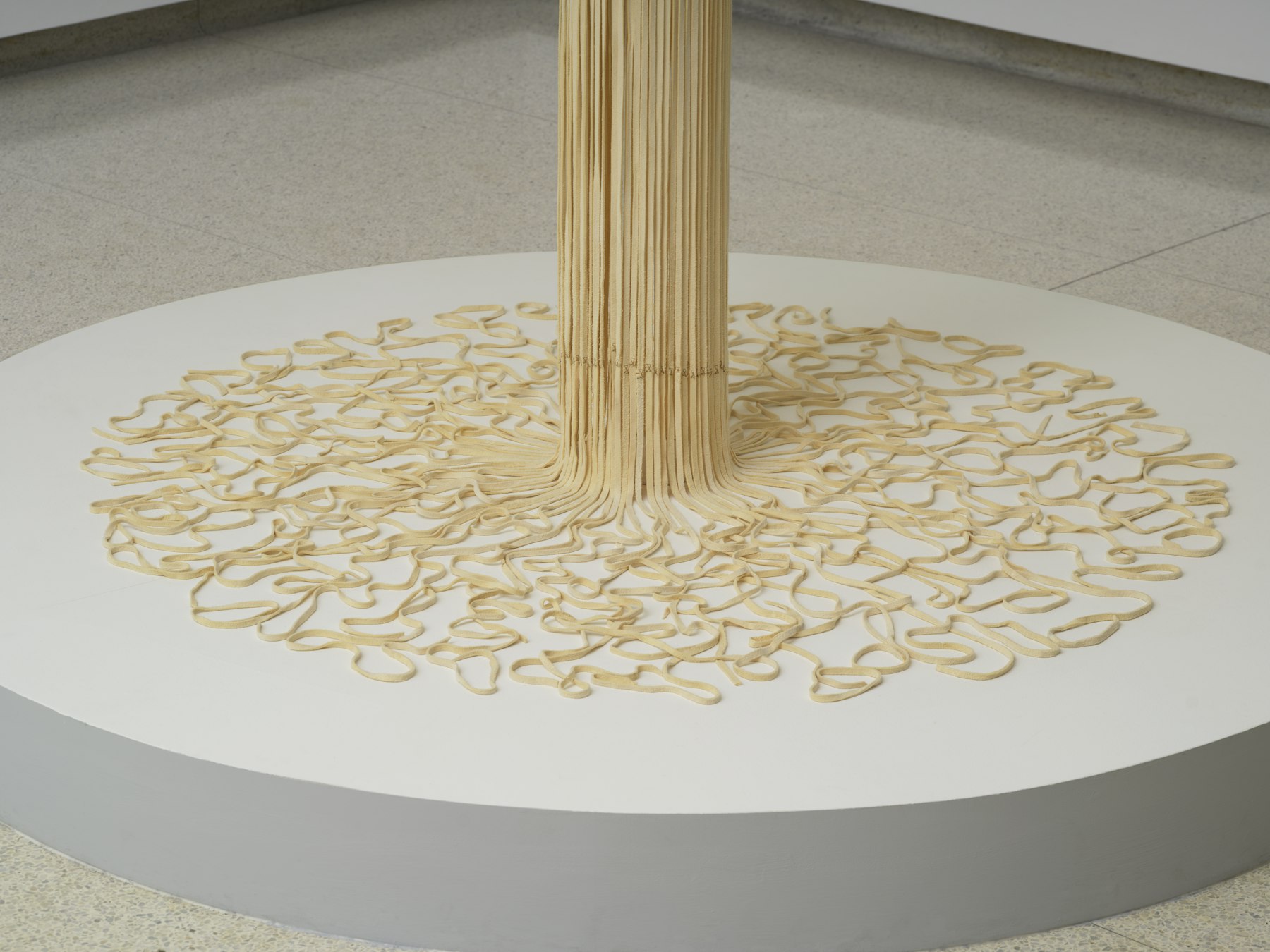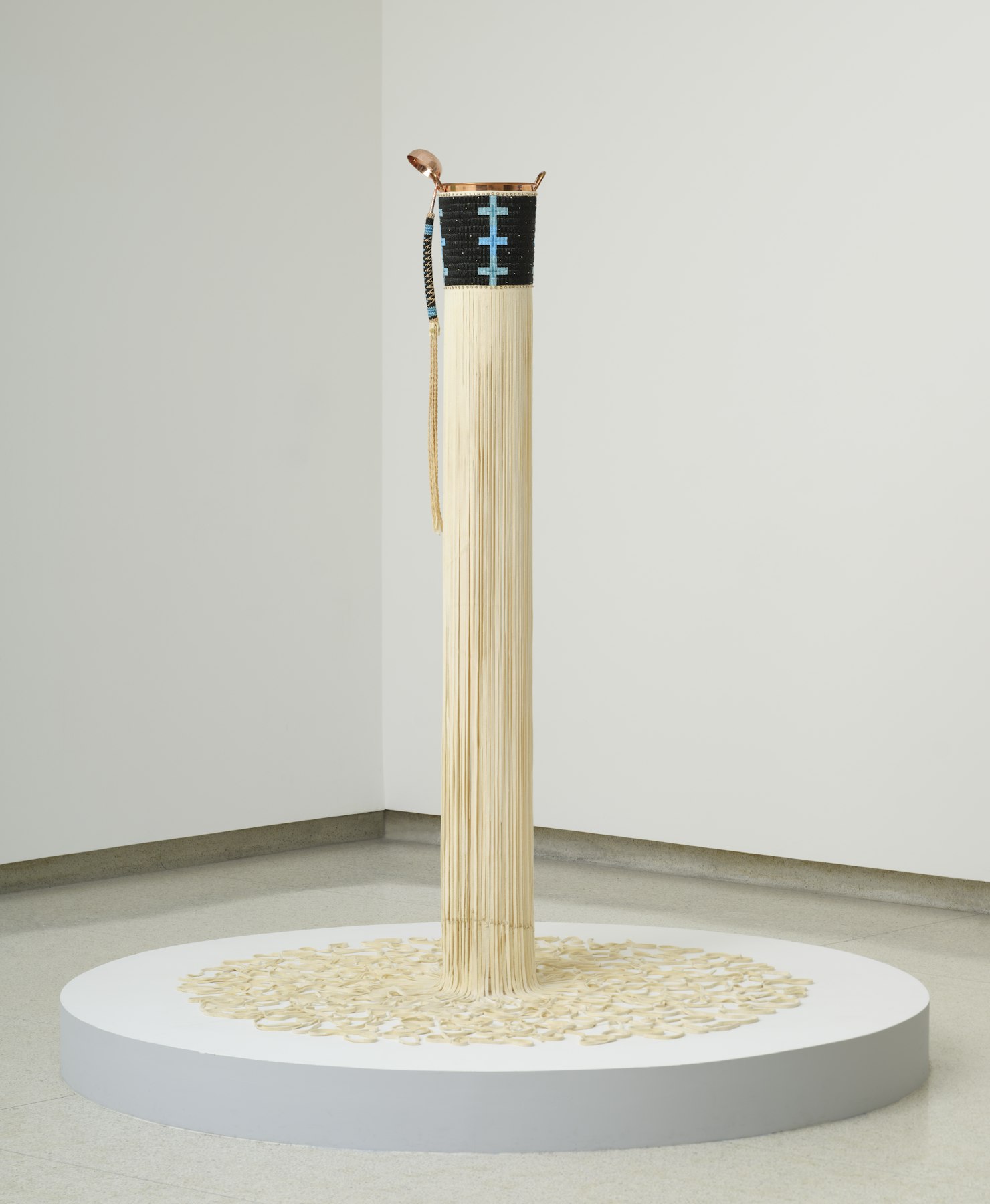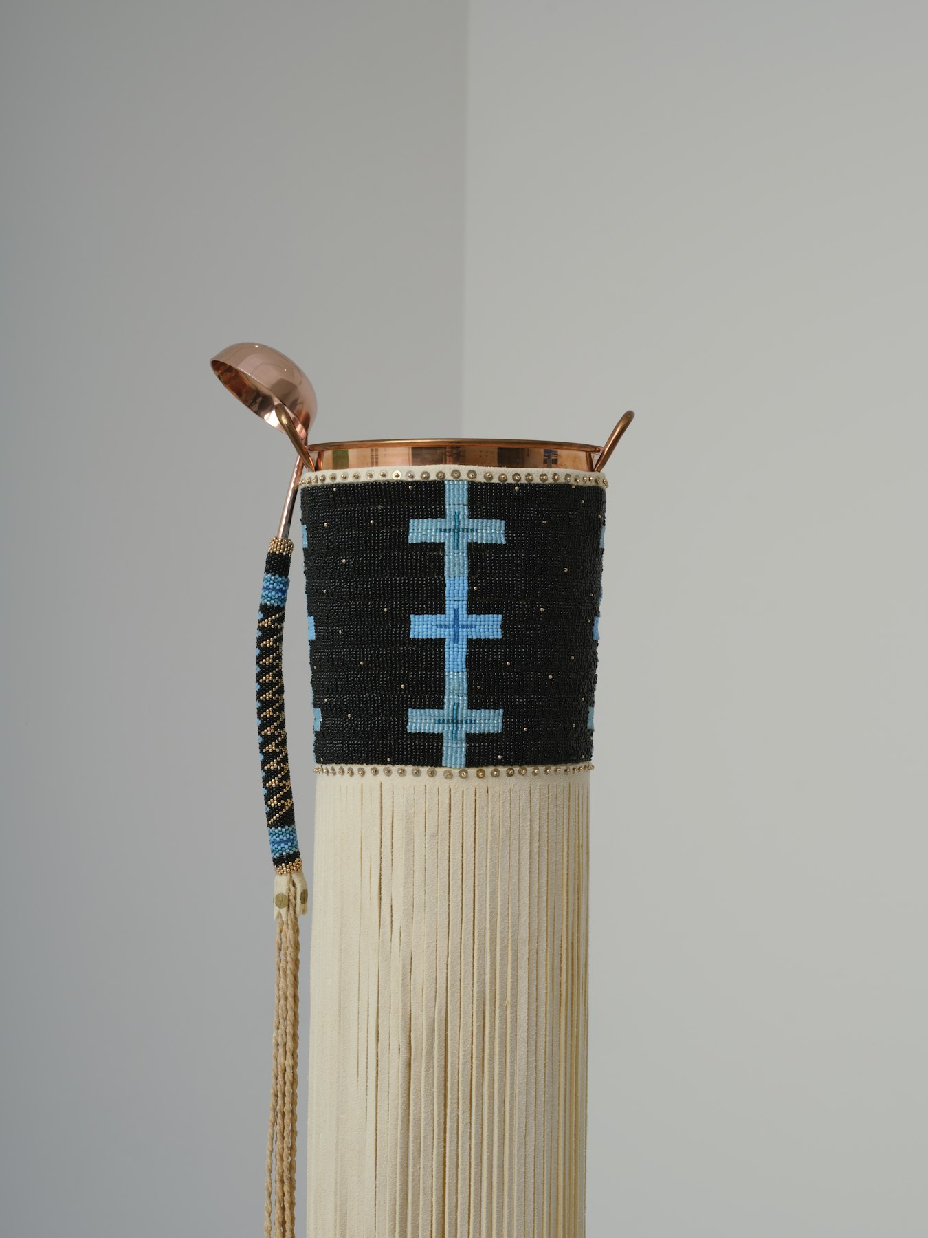 - buckskin, synthetic sinew, glass beads, brass sequins, copper vessel, copper ladle
