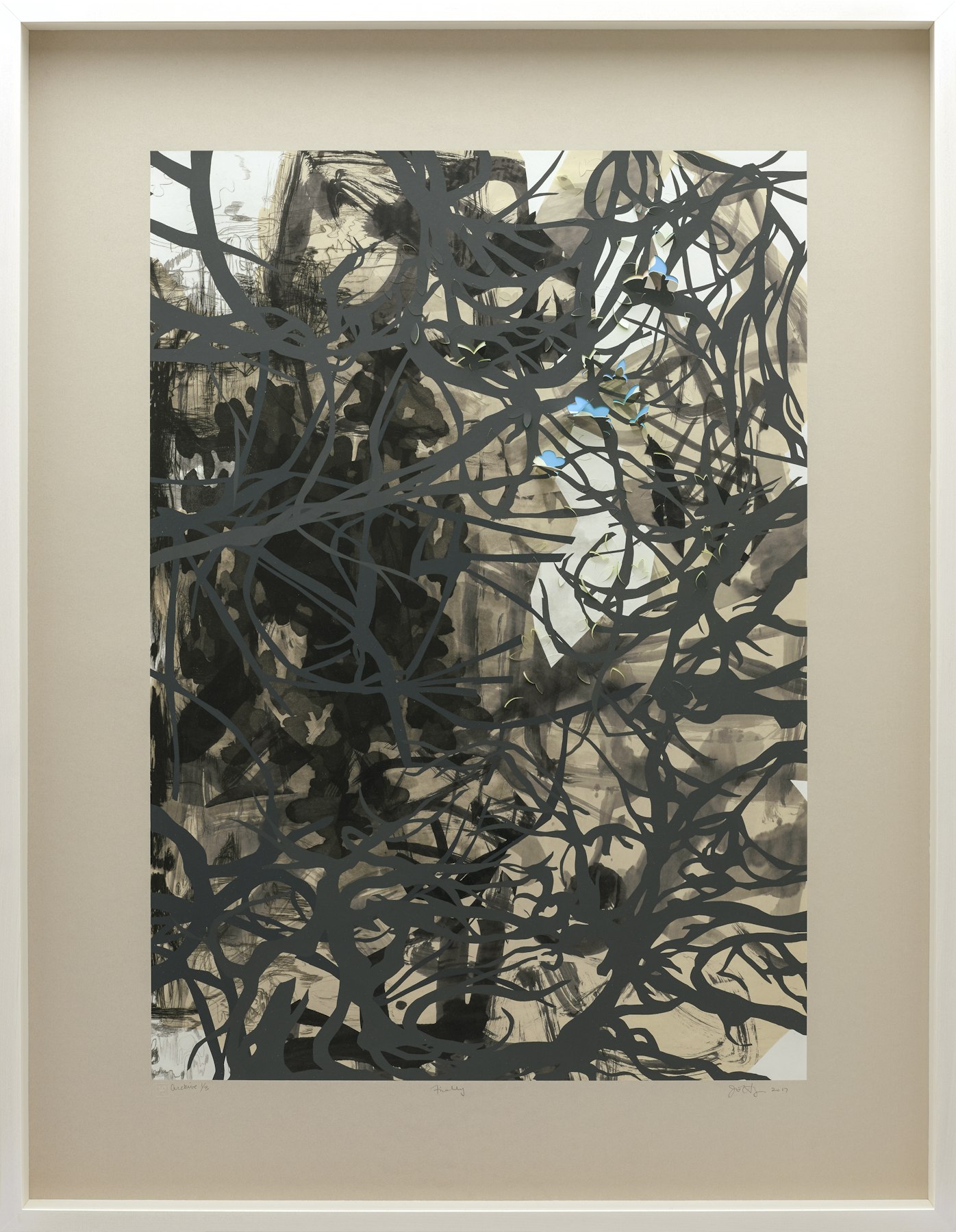 - Intaglio (aquatint, drypoint, sugar lift and spit-bite), screenprint, inkjet print, chine collé, hand-cut and folded, holographic foil element