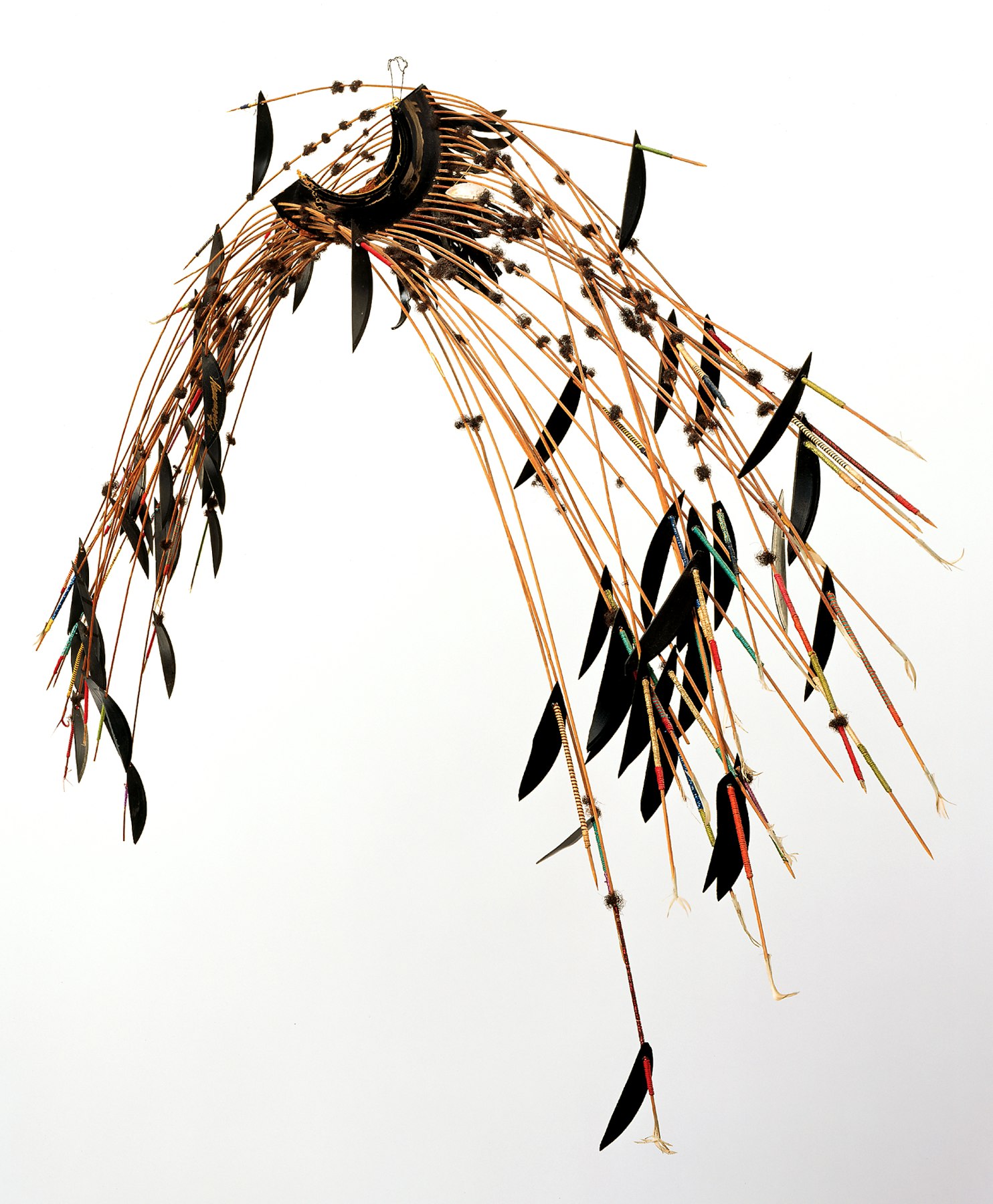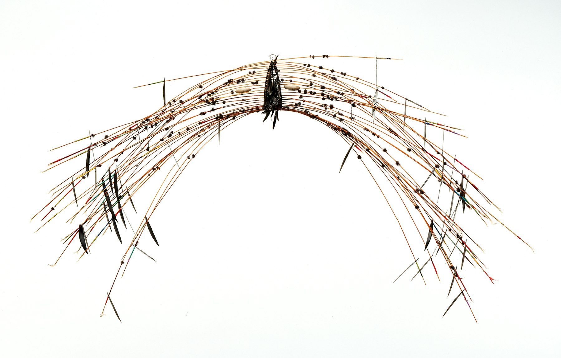- phonograph record fragments, hair, clay, plaster, feathers, bamboo, colored string