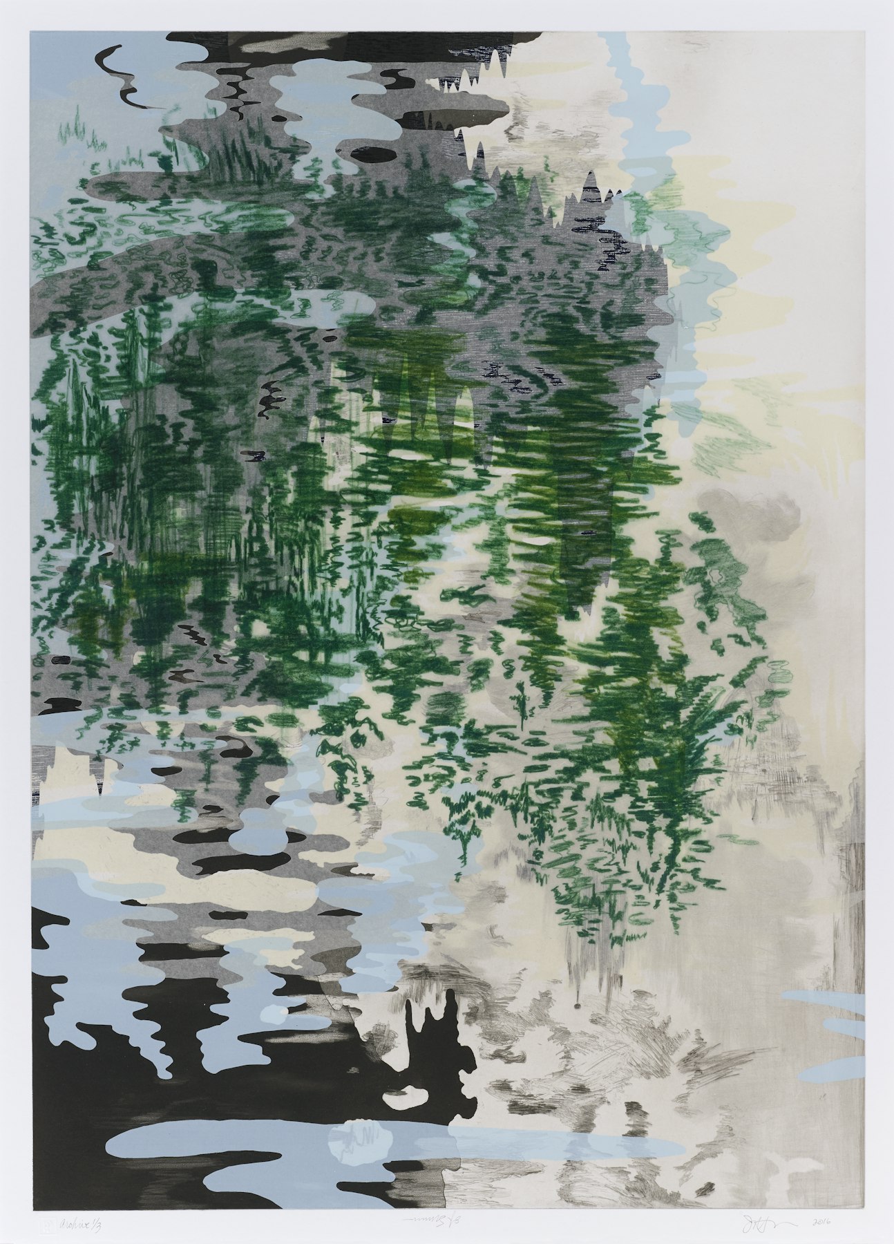 - Intaglio, screenprinting, woodcut collé and pigment printed Gampi sheet with cut outs