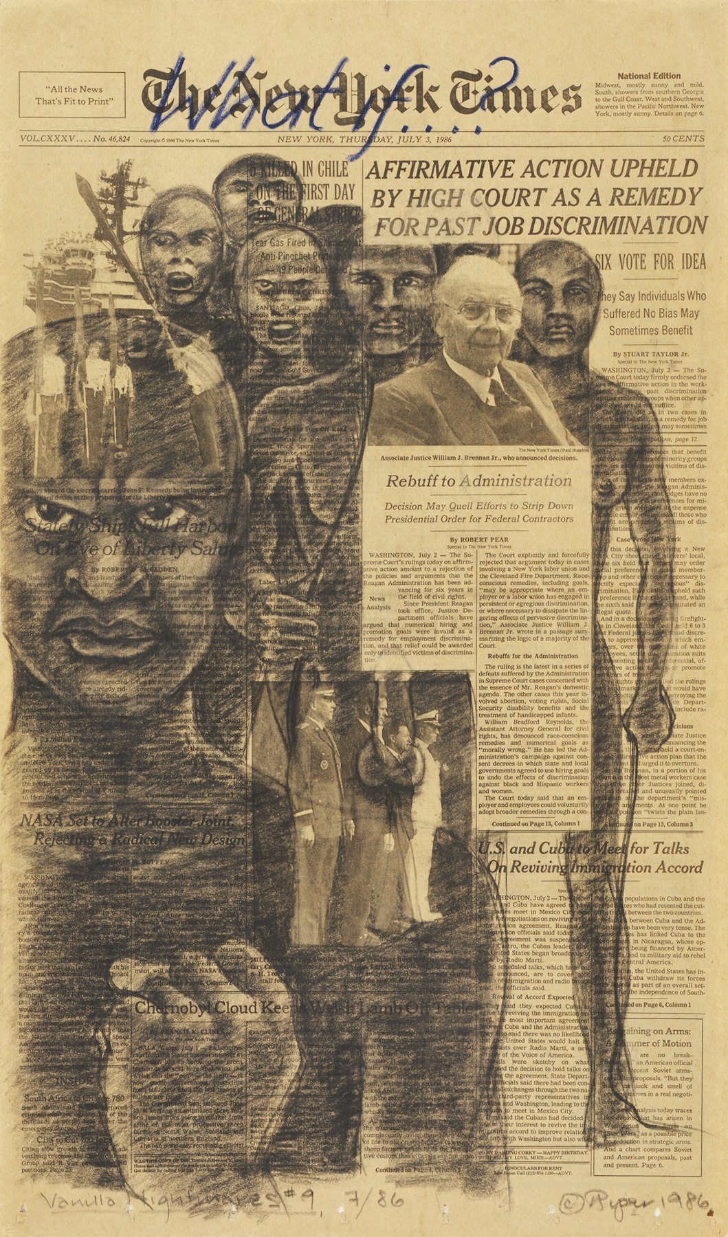 - charcoal, oil crayon on newspaper