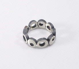 Dominique Bereiter describes their work as a “reflection of my imagination, my spirit, and my connection with people.” Bereiter’s work is hand-fabricated from sterling silver, gold, and copper. Most of the pieces are sawed, textured, filed, and soldered together. They are also oxidized, giving a darker and richer appearance.