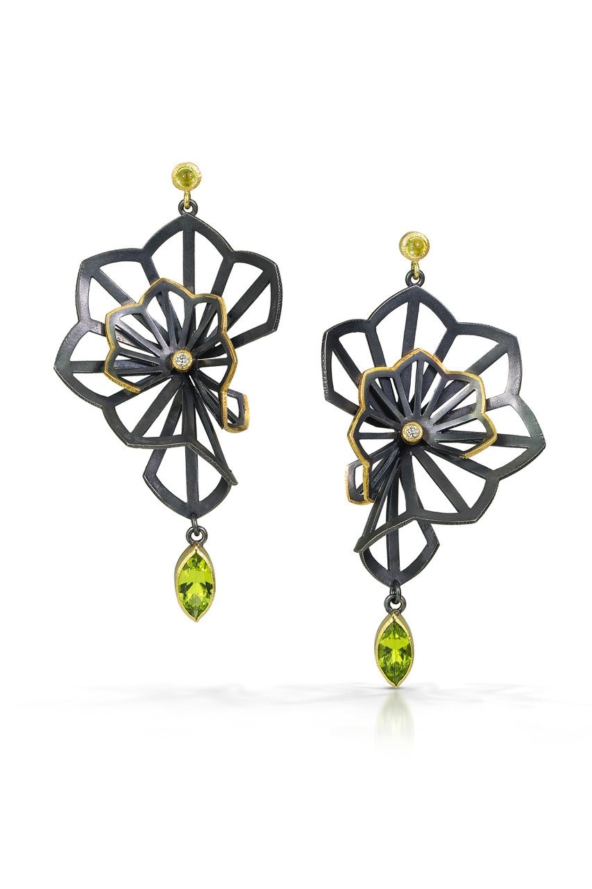 Karin Jacobson is committed to meticulously crafted, art jewelry and wedding rings. Each piece is hand-fabricated and focuses on ethically sourced materials. This collection was inspired by Origami and Kirigami, (a variation of origami that includes cutting of the paper). She wanted to try to take flat shapes and fold them into voluminous 3D forms. Metal does not fold the same way that paper does, but to Jacobson, these pieces capture the spirit of the form.