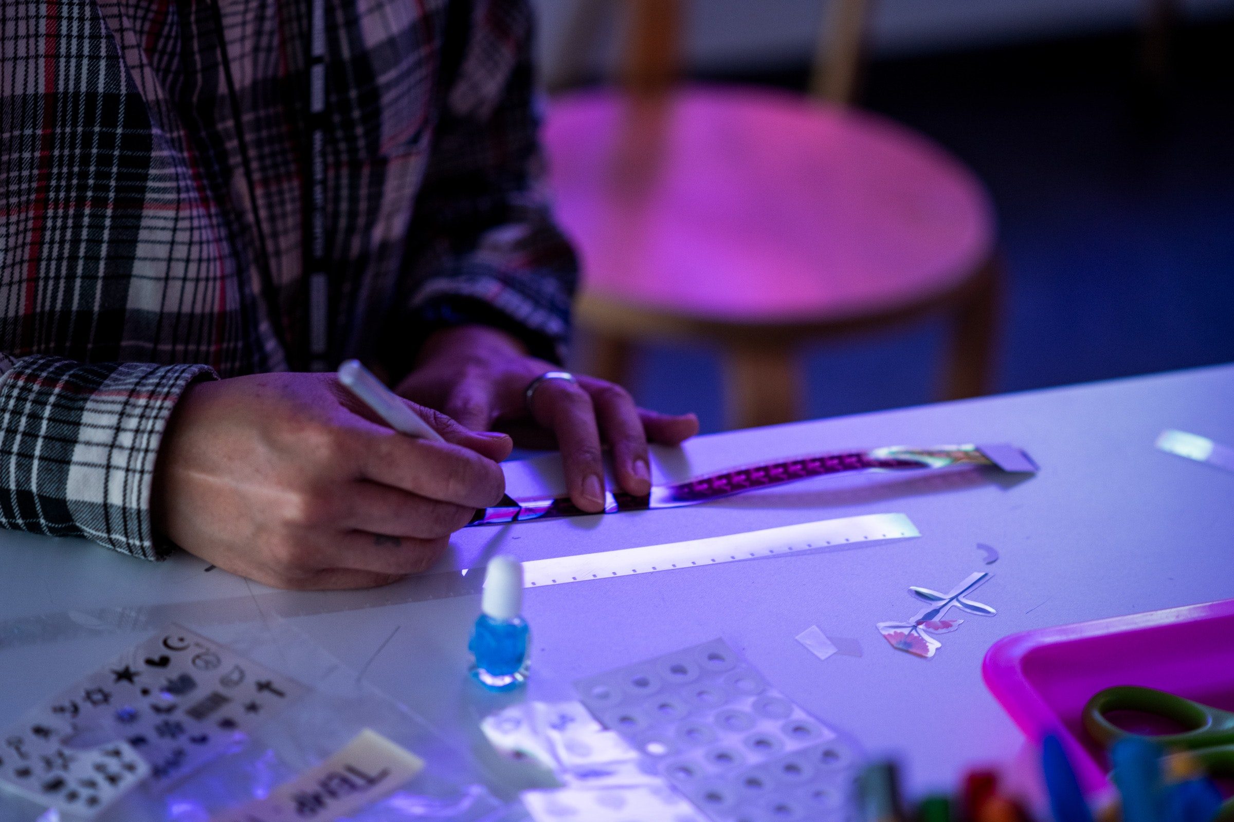 Make futuristic accessories using foils, neon fabric, and scrap materials. Bring your own designs or use the templates provided.