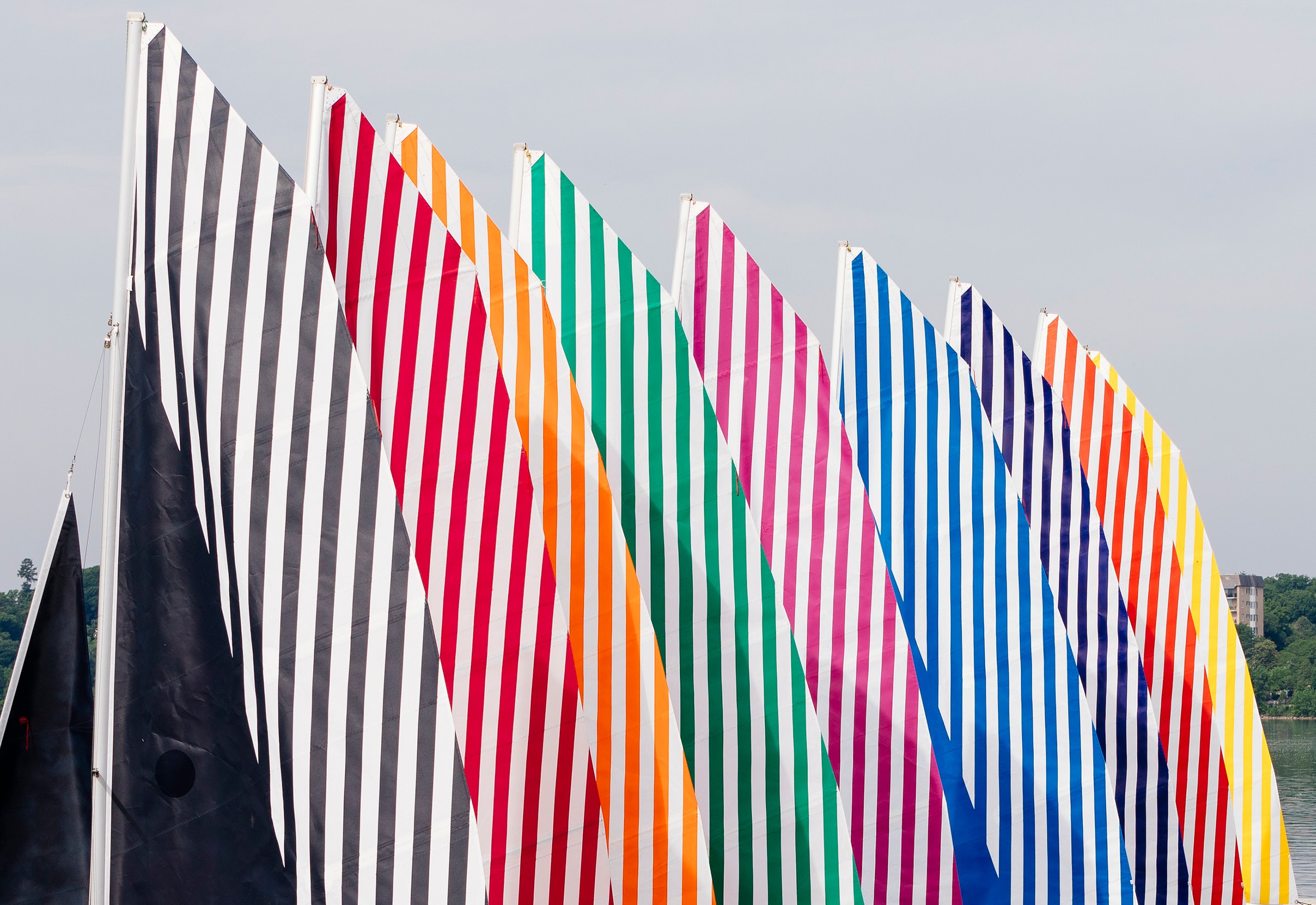 This summer, experience Voile/Toile – Toile/Voile, the US premiere of a major public artwork by conceptual artist Daniel Buren (France, b. 1938). For more than 50 years, Buren has been extending the possibilities of painting, placing brightly striped works in public spaces—on monuments, city squares, billboards, and train stations—around the world. Voile/Toile – Toile/Voile is a two-part artwork comprising a public performance and installation, marking the first presentation of the work in the United States. The performance takes the form of a sailboat regatta on Bde Maka Ska (formerly Lake Calhoun) in Minneapolis on June 23, featuring the artist’s signature custom-made, striped sails. An outdoor installation of the sails will be featured in the Minneapolis Sculpture Garden’s Cowles Pavilion on the Walker campus. Conceived especially for Minneapolis, known also as the “City of Lakes,” Buren’s commission celebrates the area’s unique landscape and identity.
