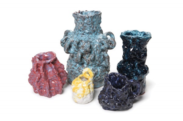 This exhibition presents significant work in clay by 22 artists spanning four generations. Ranging from modestly scaled pots to figurines to large sculptures, these objects cross a spectrum of conventional delineations among fine art, craft, and outsider practices. Collectively they suggest that clay appeals to basic impulses, starting with the delight of building form, coupled with the anxiety of completion. All of the works on view appear to be in some state of flux or growth. Clay is a base material. From potsherds to porcelain fixtures, clay is synonymous with the building of industries and cultures. At the same time, its very materiality—its tactile malleability, earthen sensuousness, and humidity—makes it the medium of more elemental associations and expressions. The immediacy with which clay allows one to build form and create ornament underlies its appeal—especially in relation to modes of fabrication that seem to take art increasingly out of artists’ hands. More specifically, this exhibition is an opportunity to examine not only clay’s appeal but craft in general. The artists in Dirt on Delight include the current generation (Nicole Cherubini, Jessica Jackson Hutchins, Jeffry Mitchell, Sterling Ruby, and Paul Swenbeck), artists who emerged during the 1990s (Ann Agee, Kathy Butterly, Jane Irish, Arlene Shechet, and Beverly Semmes), those who established clay as a critical material during the 1960s and ‘70s (Robert Arneson, Viola Frey, Ron Nagle, Ken Price, Adrian Saxe, Beatrice Wood, and Betty Woodman), and historic and outsider figures (Lucio Fontana, Peter Voulkos, and Rudolf Staffel, as well as George Ohr and Eugene Von Bruenchenhein).