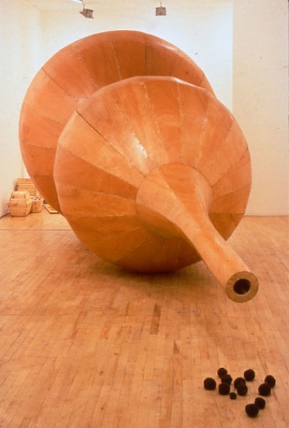 Huang’s sculptures and installations–drawing on the legacies of Joseph Beuys, Arte Povera, and John Cage as well as traditional Chinese art and philosophy–routinely juxtapose traditional objects or iconic images with modern references. Eight-Legged Hat (2000) pairs ancient Egyptian ibis with a pith helmet, reflecting Egypt’s colonial past. Other works resonate with more recent events: Bat Project II (2002) is a replica of the wing from the U.S. spy plane that collided with a Chinese fighter jet in 2001, setting off a weeklong international standoff. Two Typhoons (2001) consists of the prayer scrolls from a dismantled Tibetan prayer wheel, echoing the continuing conflict between Communist China and Buddhist Tibet.