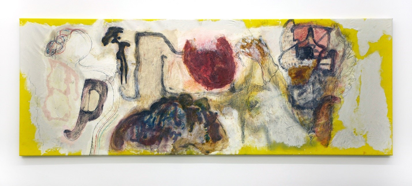 Bridging abstraction and figuration, Eichwald’s densely layered paintings—often made on unconventional surfaces such as printed canvas or imitation leather—bear an alchemical combination of acrylic, oil, tempera, spray paint, mordant, graphite, varnish, and lacquer. Whether in large- or small-scale formats, her works combine smooth paint strokes and quick smudges, at times revealing figurative forms and snippets of text. While Eichwald’s works are part of a lineage of abstraction, they resist any direct connection to a particular movement or period, instead amalgamating and churning through the history of painterly styles and techniques.