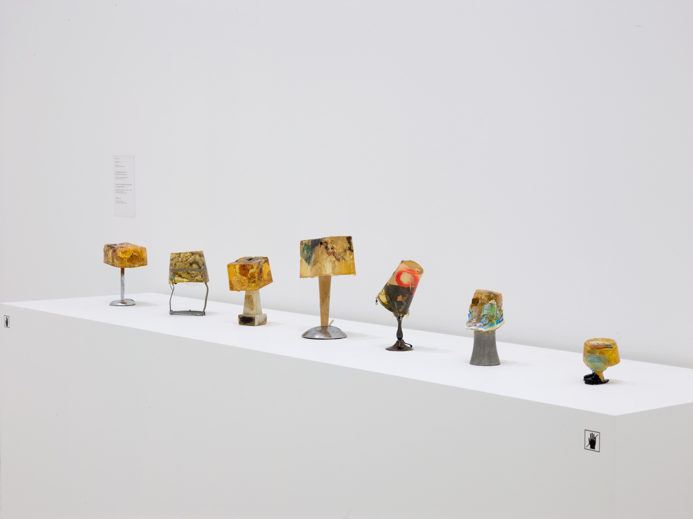 To create her sculptures, Eichwald pours resin into bags, rubber gloves, and plastic bottles, in which she collects—like objects captured in amber—uncommon and dissonant materials, such as chicken bones, erasers, jewelry, mushrooms, fishing tackle, needles, candy, small drawings, and hard-boiled eggs. At once repulsive and alluring, grotesque and seductive, these pieces bring to mind associations ranging from trophies and time capsules to the human digestive system. Filled with humor and wit, Eichwald’s works draw on references to theology, philosophy, and art history, while also reflecting on her own life: her surroundings, thinking, reading, and friends.