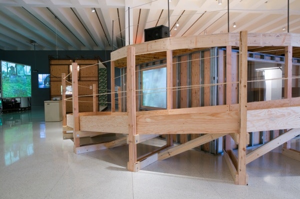 The core of the exhibition is composed of three new projects built on-site by past Walker artists-in-residence. Choreographer Ralph Lemon’s installation is a landscape of memory and history re-created from his stage set for Come home Charley Patton (2004), the third part of his Geography Trilogy co-commissioned and presented by the Walker. This work collides with and counterbalances other scenarios of “home” made by Catherine Opie and Sam Durant during their residencies in 2002. Filmmaker Spencer Nakasako, whose self-activated video booth was shown here in 2001, creates a digital media station for recording and playing videos within the exhibition as well as expanding interactive communication between the gallery and the outside world. Visual artist Rirkrit Tiravanija, continuing his influential practice of transforming the gallery into a social space, builds a stage/lounge enlivened by a series of programs for use by visitors.