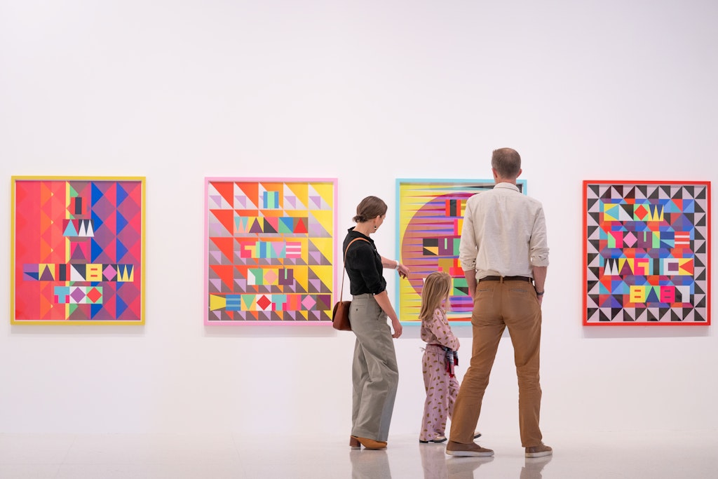 Built around five exploratory zones—Play, Make, Find, Read, and Watch—Show & Tell encourages young people to approach contemporary art with creativity and imagination. Where Cas Holman’s Critter Party (2024) offers a sculpture to touch, climb on, and modify, Caroline Kent’s colorful abstractions inspire kids to create their own collages to project in the gallery. A porthole wall reveals a trove of hidden surprises, from a miniature Spoonbridge and Cherry to a family of funky creatures. And in the comfy “Watch” zone, a varied selection of short films prompts curiosity and conversation.